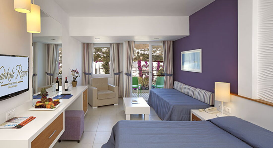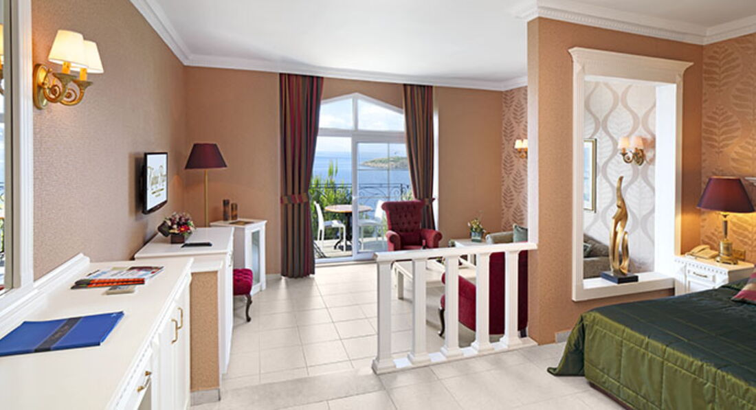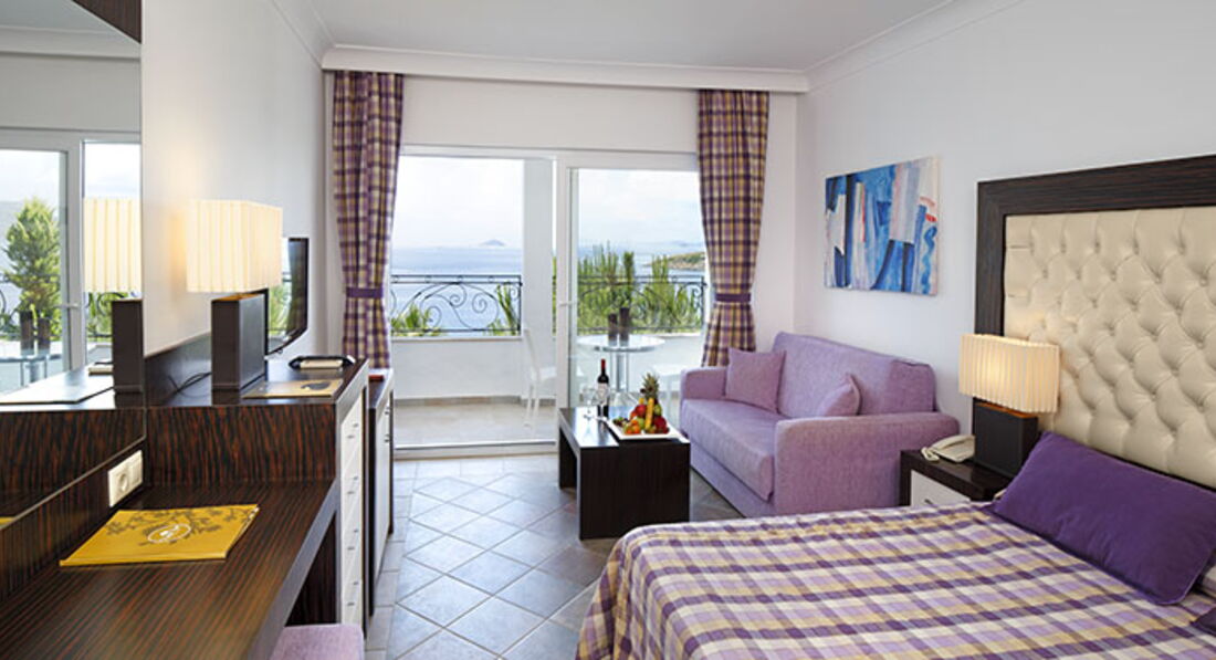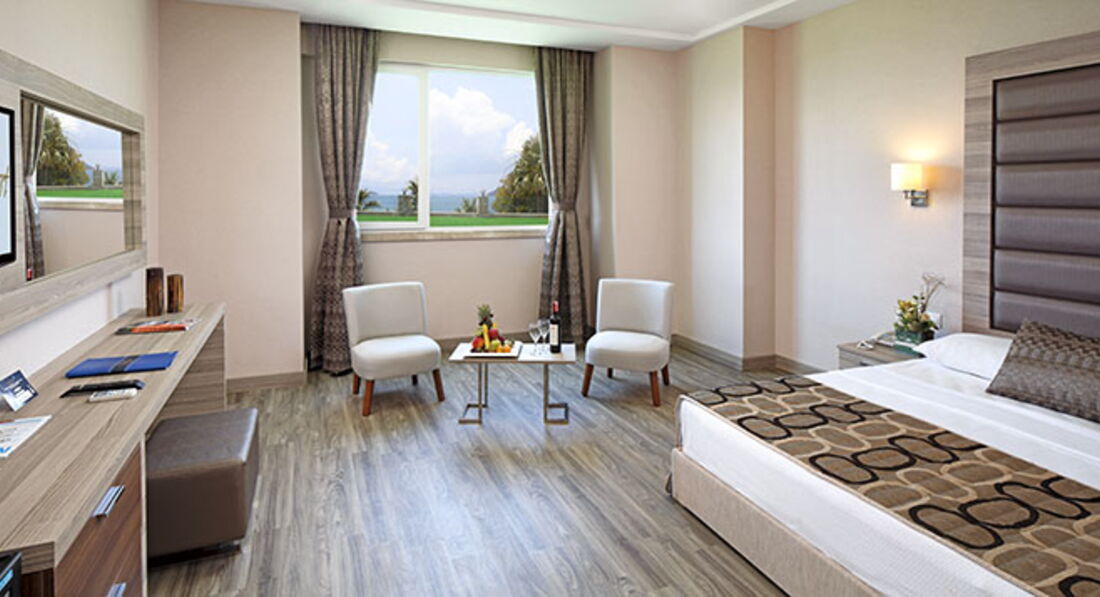 Сам номер на первой линии, небольшой, Standart sea view, с огромной двуспальной кроватью и диванчиком, но самое главное- просторный балкон и потрясающий вид на море и релакс-бассейн. Впервые за время моих путешествий осталась довольна качеством уборки : полы мылись ежедневно , менялось и пополнялось все, что положено.
