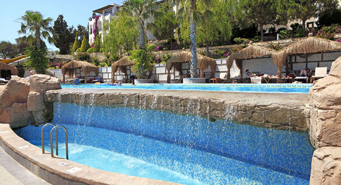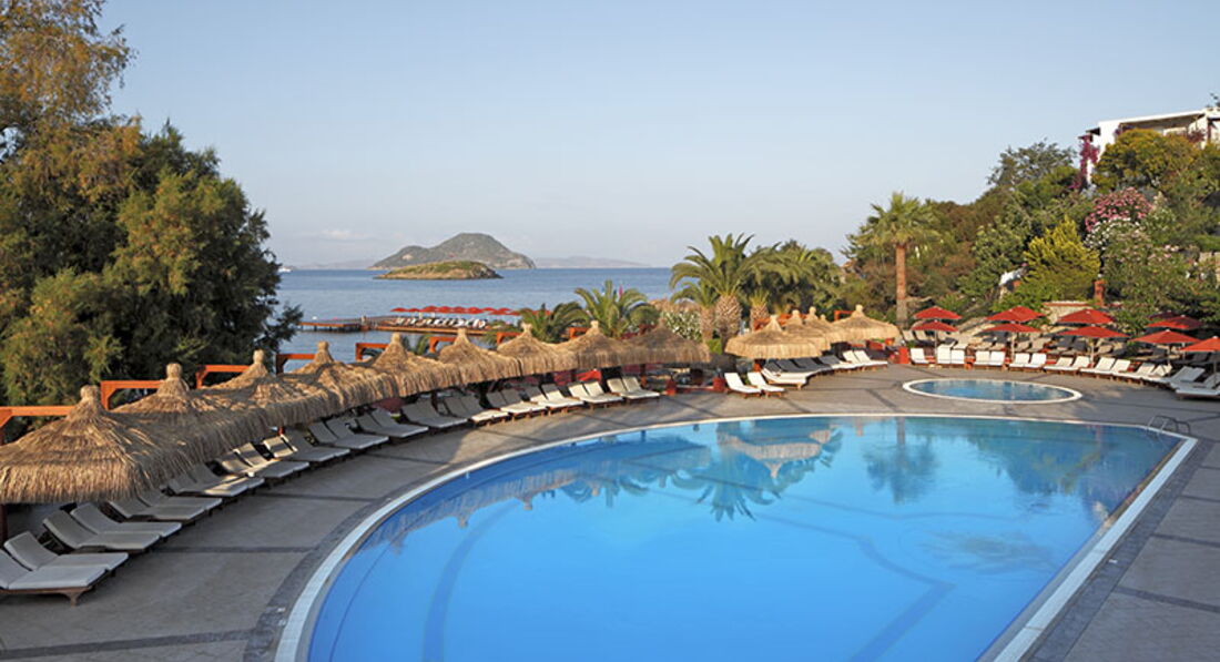 Добрый день, отдыхали в этом отеле в июле двумя семьями с детьми (3+4) достаточно большой компанией. дети от 8-до16 мы 35-40 лет. Сразу скажу-выбирали отель коллегиально, что довольно сложно, поэтому это был своего рода компромис. Но когда прилетели в Бодрум мне уже все нравилось-отпуск начался! Но что касательно отеля: первый минус, как по мне то это расположение-далеко от Бодрума. Мы в Бодруме уже отдыхаем не первый раз и привыкли ,что сев долмушу 10 минут и ты в центре, а тут полтора часа. Но это если хочется приключений , покупок и др. А если сидеть в отеле то вполне можно. Сам отель не новый и не старый , есть моменты пугающие, но где их нет? Питание очень даже хорошее-из-за стола обычно "выползали" и дети и взрослые. Алкоголь папы продегустировали в полном объеме :) и могу сказать , что если вы не привыкли только к коньяку Martel XQ и только немецкому пиву , то все очень даже. Присутствует аспект отношения к русским и наливания- то мало , то в последнюю очередь, но волшебная фраза - my friend!!! Please! Thanks you! моментально решала все вопросы и напряжения. Ну а к дамам и без всяких танцев с бубнами отношение на 5+! Самое приятное в этом отеле это близость моря и само море- в Бодруме оно просто шикарное-кристальная вода с кучей рыбок. Обязательно берите с собой маску! Лежаков всем хватало, если не спать весь день в номере. У нас дети ходили занимать лежаки прямо перед завтраком и после него мы уже были на пляже. Многие (в основном европейцы) предпочитают бассейн. Есть проблемка с лепешками и гамбургерами на пляже-образуются очень большие очереди, как и за мороженым. Но оно есть! Присутствует на территории и спорт зал, как для отеля норм. Вечером развлекались сами, т.к. анимацию даже дети-подростки не поняли. Мы тем более. Номерной фонд в основном уставший, но ремонтируется. Персонал старается реагировать на просьбы и пожелания отдыхающих.