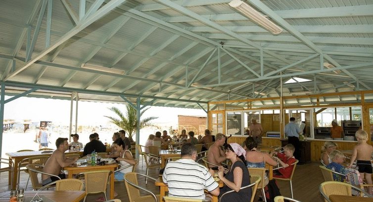 (100 м.) Питание неплохое, но по общему антуражу и стилю обслуживание это скорее приличная столовая, чем ресторан. Частенько слышала от других отдыхающих - "ну что, пошли в нашу столовую". В Амелии чень вежливый персонал, стараются. Много раз слышала "Очень вкусно, спасибо - Спасибо, приходите, ждем" и тп. Кухня хорошая, много овощей свежих, печеных, жареных, фаршированных.. Утром напитки входят в стоимость, вечером нет. Отдельно про напитки. Чай - болгарский травяной. Кофе не пейте - сделайте это в любом другом кафе или ресторане. Вариантов, где поесть и за какой бюджет, в Албене масса. Очень хороший кофе в греческом ресторане Калиопа, при отеле. Очень хорошая карта напитков в баре Ганви на пляже, не далеко от отеля. Оба утомянутых заведения - отличные, рекомендую посещать. В ресторане Калиопа помимо основного зала и террасы на улице, есть пиццерия на пляже. Пиццу втч можно заказать на вынос. Помимо ресторана в отеле есть бар в холле и бар у бассейна, и там и там хорошая коктельная карта.