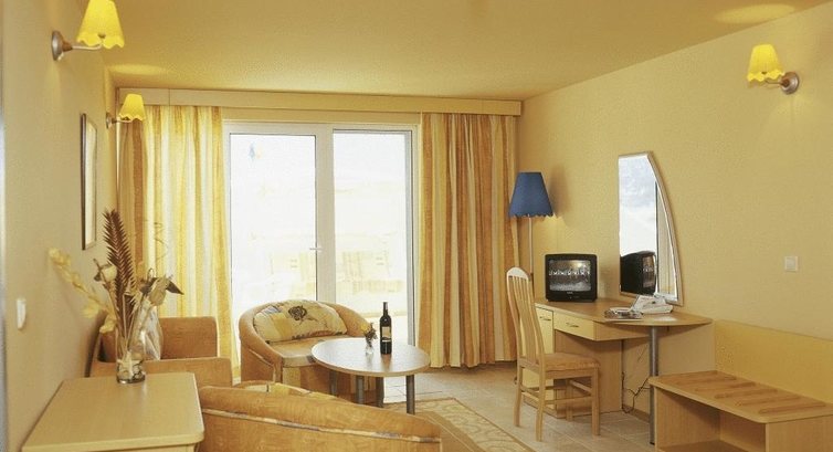 Отдыхали в этом отеле в сентябре, когда уже спал поток отдыхающих, и видимо поэтому нам дали замечательный номер с видом на море. Номера обставлены просто, но мебель не старая, ремонт довольно свежий, чисто. Общее впечатление благоприятное. В номере балкон, тв, минибар. В ванной сантехника новая, тоже все чисто. Уборку номера делали регулярно и качественно (с моря тащилось много песка, особенно заметное количество скапливалось в ванной на полу, так после уборки все было идеально).