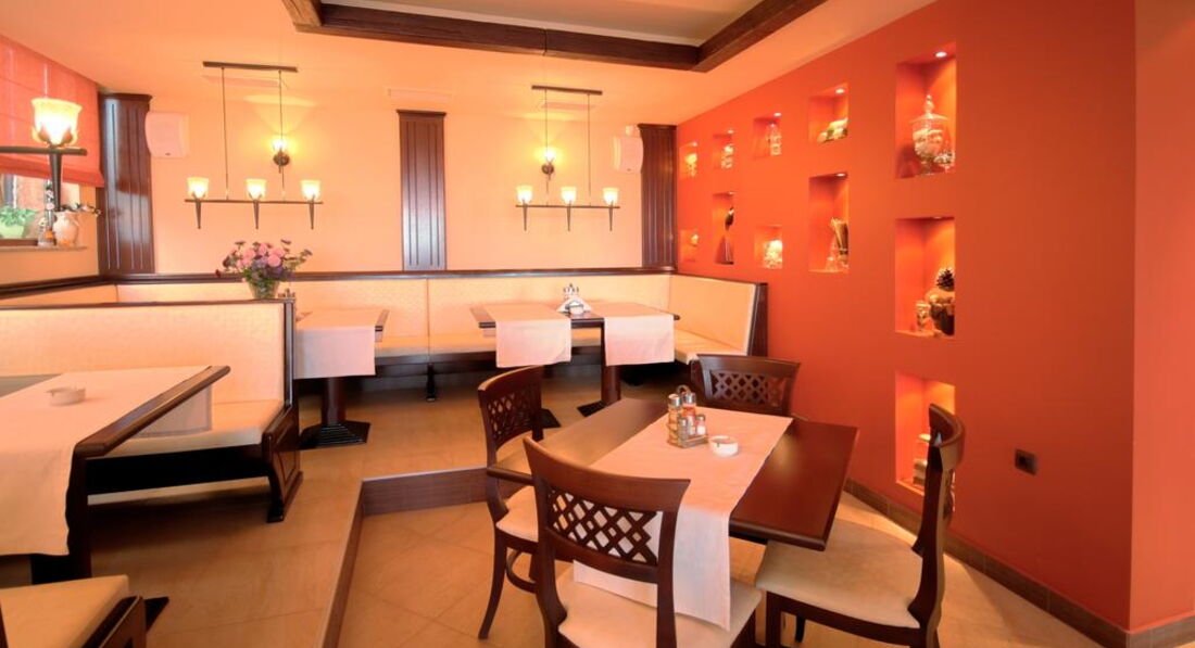 Ресторан. Кормили блюдами на выбор на завтрак. Обеды предлагали комплексные за 5 левов, но мы так ни разу и не заказали там обеды. Мы вообще редко там кушали, не считая завтраков. То, что ели в ресторане тамошнем было вкусно. Обслуживание хорошее. Сама хозяйка с хозяином иногда обслуживали. Был приятен этот факт! При террасе ресторана была маленькая игровая площадка. Всякие там домики, качелька и что-то там ещё. Я особо не приглядывалась, выросла с того возраста.