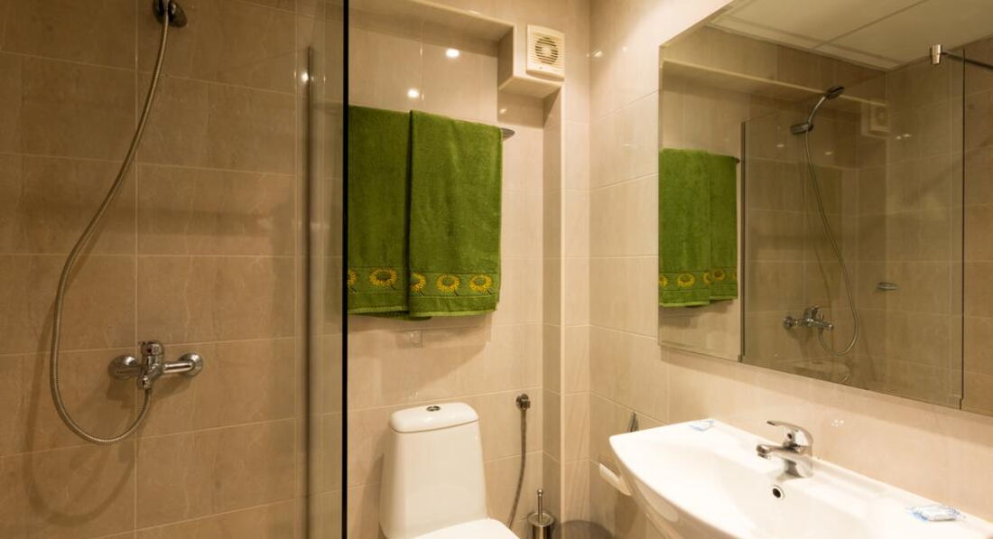 Провели в гостинице 7 ночей с ребенком 6 лет. Вид из номера шикарный, мы жили в №303. Есть балкон, на котором приятно посидеть, вешалка для сушки белья, прищепки. Кстати, на каждом этаже стоит гладильная доска и утюг, очень удобно. В номере удобная двухспальная кровать, а вот допместо это раскладной пуф, ребенок спал в 20 см от пола, не очень приятно, т.к. на полу ковролин, не первой свежести. Шкаф для одежды вместительный, есть тумбы и туалетный столик. На стенах обои. С/у нормальный, душевая за шторкой, есть перегородка, так что вода не выливалась на пол. Уборка посредственная, постель меняли один раз, полотенца два. Мусор выносили через день. В с/у протирали пол только по середине, по углам грязь, волосы, запах канализации постоянный, сантехника при заезде была грязной, купила дез средства и убрала сама, неприятно, но еще больше не хотелось начинать отдых с выяснения отношений. Вспомнилась передача Ревизорро, думаю извели бы много перчаток при проверке)) Звукоизоляция номеров так себе, соседей слышно хорошо! До моря пешком минут 10, конечно это не первая линия, но нас не напрягало и к лестнице на второй день привыкли, только плюс, зарядка. Дискотека Revue напрягала, каждую ночь, с 12 ночи до 6 утра. При закрытых окнах спать можно, но не в тишине, ее все равно слышно. Конечно это не минус самому отелю, он здесь не виноват, такое расположение. Завтраки: нормальные, но однообразие утомляет, не понятно почему готовят только омлет, можно хоть изредка чередовать с яичницей и отварными яйцами. Хлеб для тостов, брынза, джем, сыр, ветчина и колбаса, хлопья. Хозяйка сама следит за пополнением блюд, практически всегда видели ее участие. Кофе из аппарата, чай несколько видов. Сейф за доп.пату на ресепшен. Там всегда есть сотрудники, все очень приятные и улыбчивые. Wi Fi в номере всегда, не скоростной, но мультики ребенок смотрел.