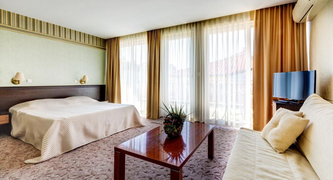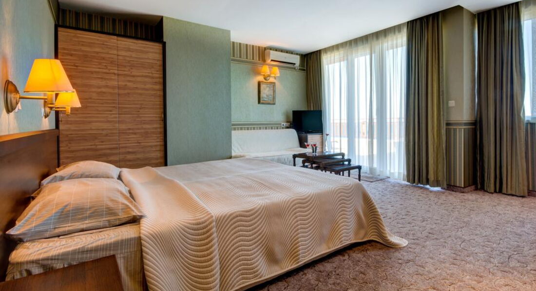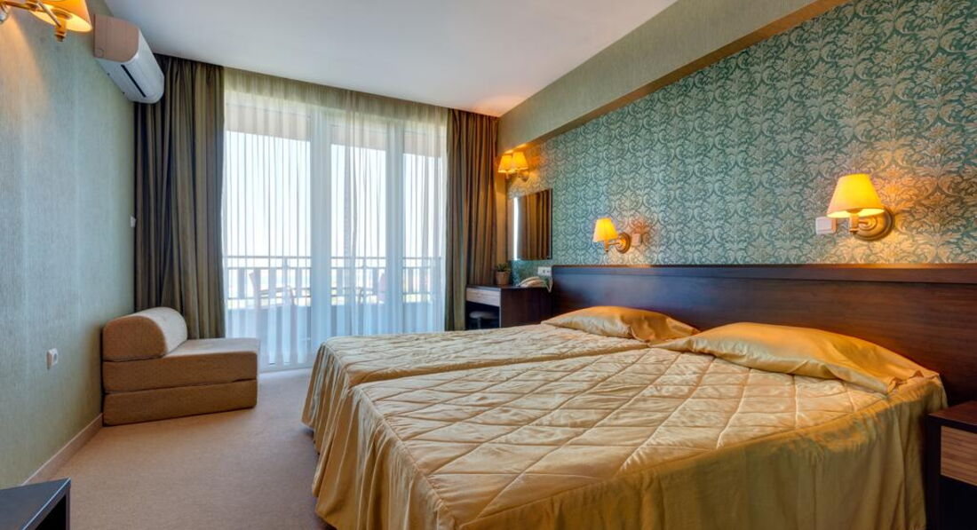Номер небольшой, в номере - большая двухспальная кровать, для ребенка - нечто среднее между матрасом и раскладушкой (кровать была бы лучше), трюмо, телевизор (русскоязычного не было, ребенок смотрел мультики на болгарском, но не за телевизором мы туда ехали), в ванной комнате слив воды - в полу (но это, видимо, для Болгарии традиционно). Кондиционер представлял собой некую старорежимную передвижную конструкцию, но работал исправно. Шикарный балкон со столиком и сушилкой для белья (ее наличие очень порадовало).
