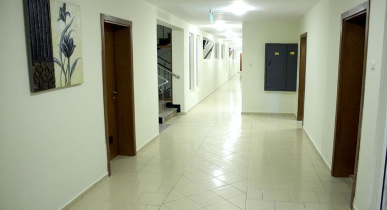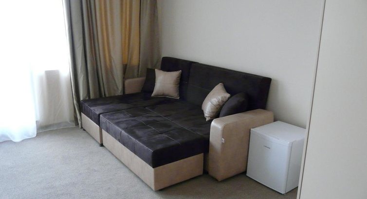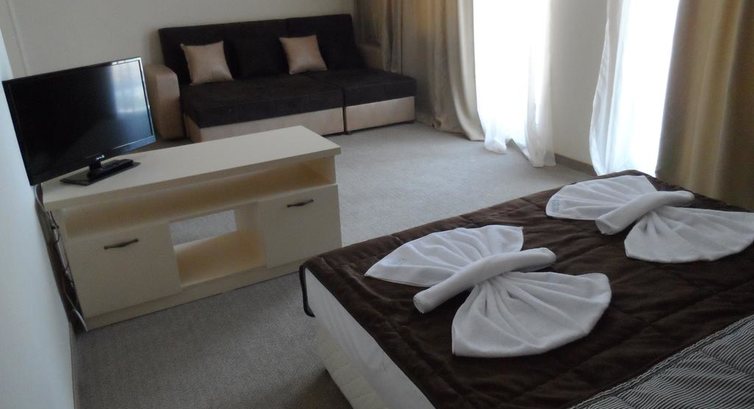 Телевизор (2 русскоязычных канала), кондиционер, холодильник с мини-морозилкой, фен - всё работало без проблем. В коридоре для вещей шкаф: отделение с полочками и отделение с "вешалками". В ванной, совмещённой с туалетом, не было полочки и душ не был отделён даже шторкой, вода течет прямо на пол, в слив, но в прошлом году отдыхала в Болгарии в "четверке", там были такие же условия, поэтому воспринимаю как часть национального колорита :) Плитка без плесени. По приезду на раковине лежало два кусочка мыла. Вентиляция работает плохо, поэтому сразу же купила освежитель воздуха.