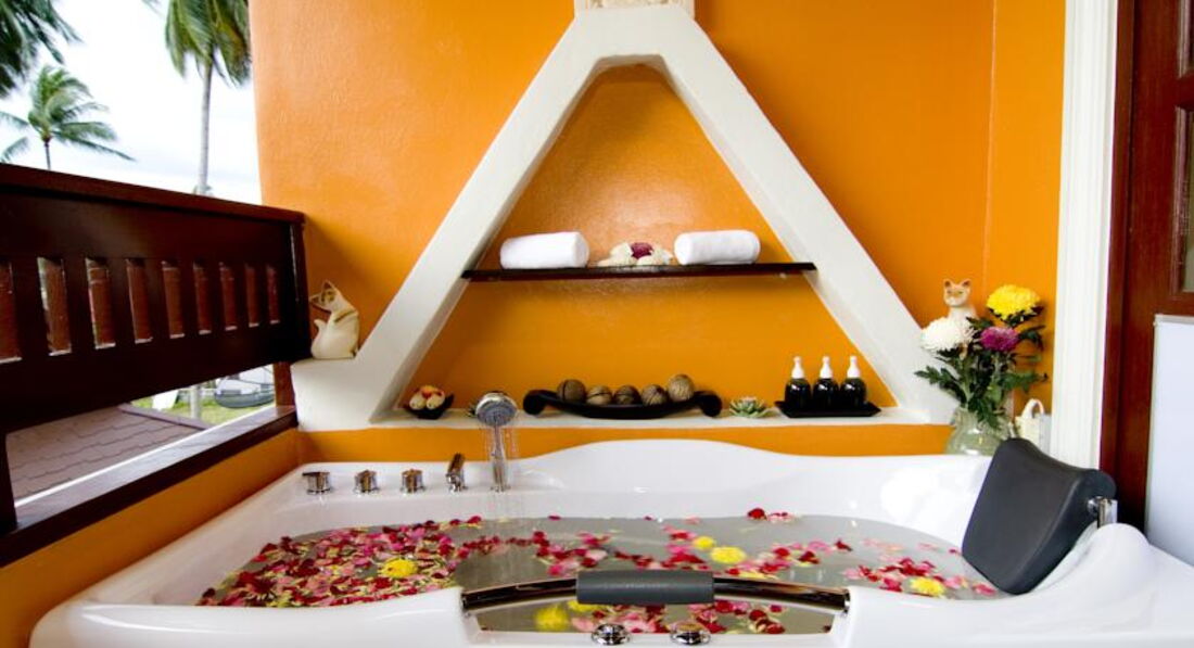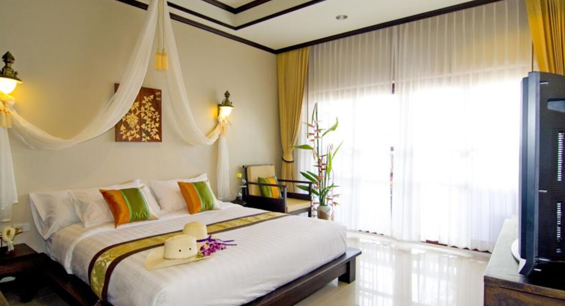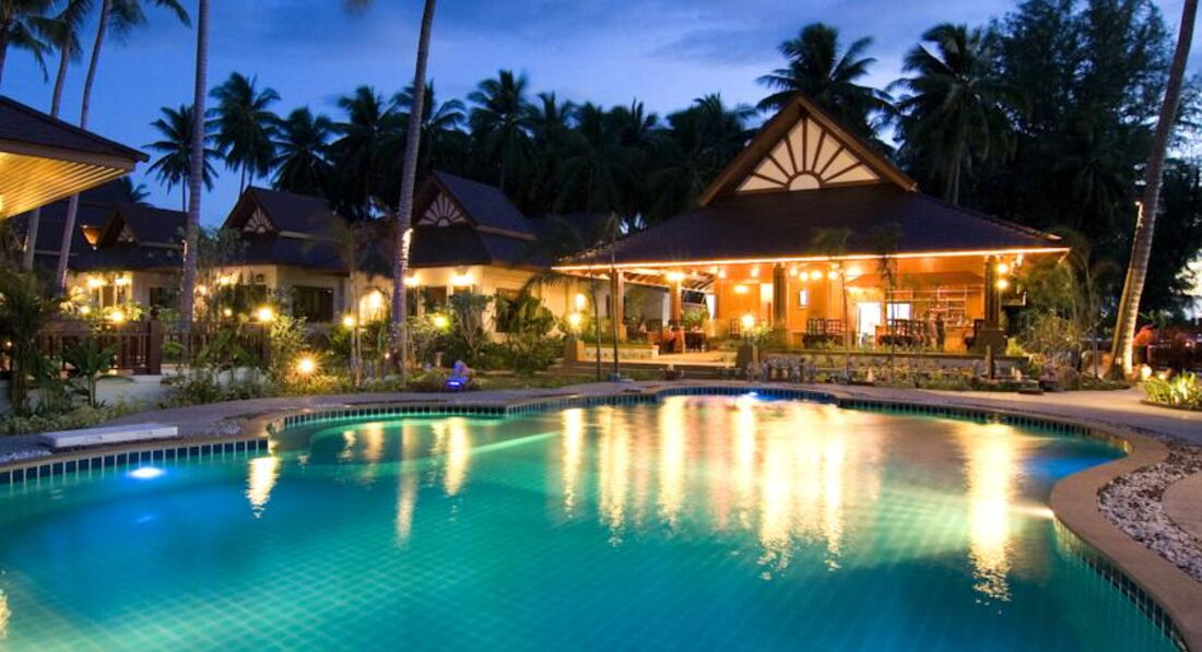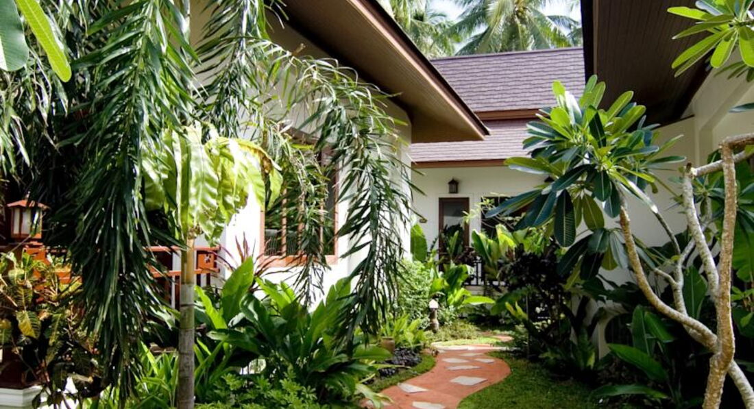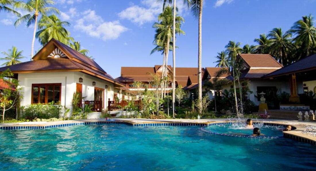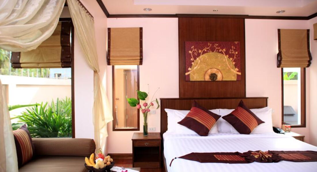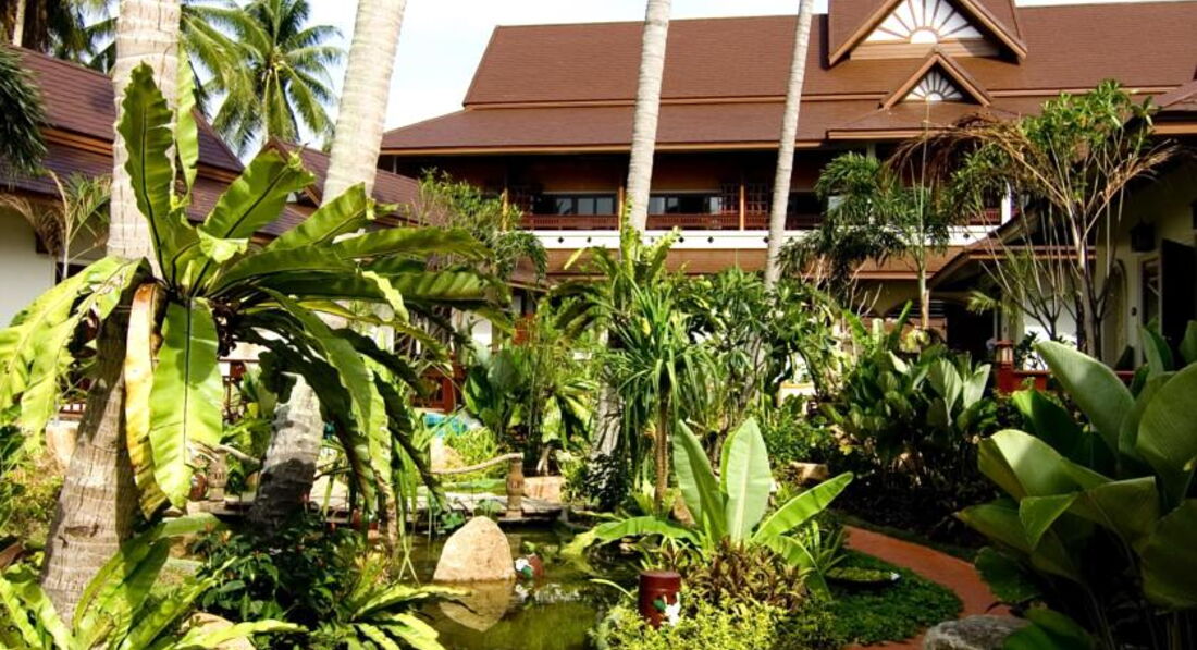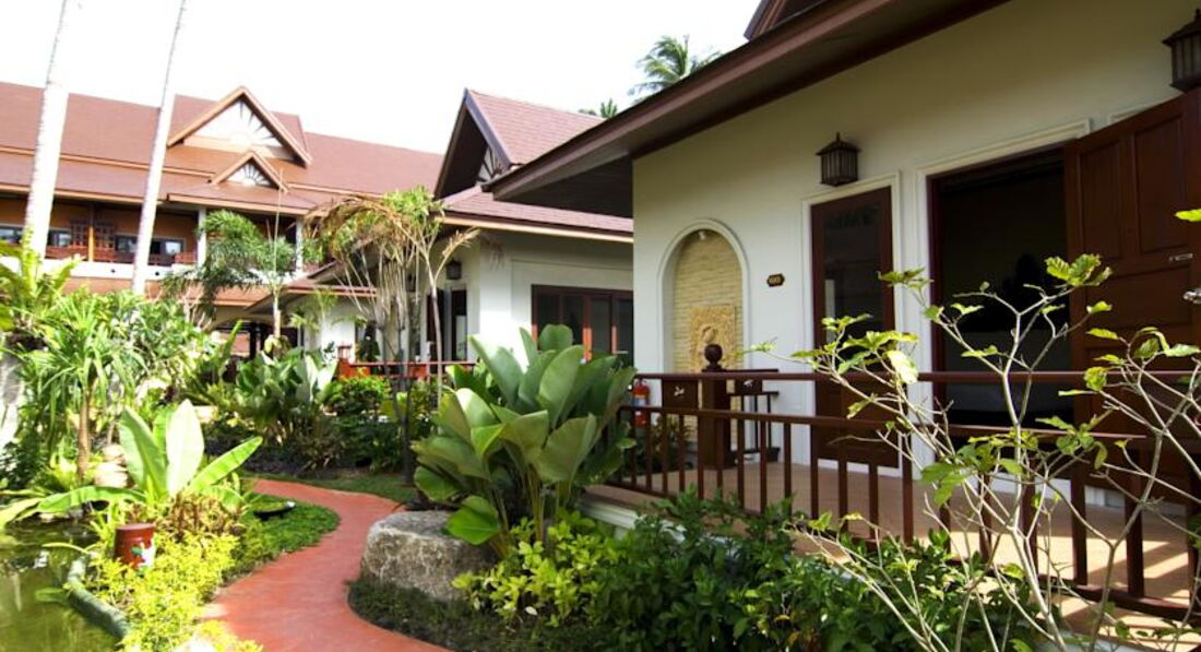 Разместили быстро, без проблем, номер с джакузи во дворе очень понравился моей дочке (9 лет). В номере все основное есть, все просто и без лишних изысков, в общем хорошо. Слегка пообшарпанные деревянные лежаки в номере и прочие "особенности ремонта 7-летней давности" лично меня не напрягали. Если вы очень щепетильны в таких вопросах, то вам не в этот отель. Территория отеля поделена на 2 части, разделяется проезжей частью, и это не проблема, машин на этой части острова мало. Территория ухоженная и зеленая, в пруду можно хоть каждый день кормить рыбок детям на удовольствие. Девушки с рецепшена всегда улыбались и старались как могли решить любые вопросы. Валюту на баты можно менять в отеле, только курс низкий был - около 29 быт за доллар США, поэтому менял на другой части острова по 33. Пляж чисто песочный, в воде глубина оптимальна как для ребенка, так и для взрослых. На пляже шезлонги бесплатно (!) для жителей отеля, также можно бесплатно хоть каждый день кататься на лодке. Иногда бывало, что после 10 утра шезлонги кончались. Приливы есть, но малозаметны, море было очень спокойным, каждый вечер красивые закаты гарантированы - с берега вид прямо на запад. Завтраки достаточно однообразные, но не противные, за 2 недели не сильно надоест. В отеле отдыхали 70% европейцы, японцы и китайцы и остальное - русскоязычное население планеты. Слева и справа от отеля есть несколько кафешек, нам особенно понравилось в правую сторону от отеля пешком 3-5 минут, кафе называется "Манго три". Вкусные свежевыжатые соки ананаса, манго или кокос всего по 60 бат, поужинать на меня с ребенком выходило не более 500 бат, когда больше , когда меньше. Можно и в самом отеле ужинать, красиво на закате, но выйдет около 1000 бат, ребенку там пицца "Гавайи" нравилась. Массаж есть только в одном салоне слева от отела, делают нормально, я на ребенка даже по полчаса договаривался. Брали экскурсию на целый день в Сафари парк: бабушка+дедушка, самое большое дерево, катание на слонах, шоу слонов, обезьян и крокодилов, обед, купание в водопаде, сафари по горам, мумифицированный монах+магический сад камней+вид на остров сверху - я и ребенок остались полностью довольны. Есть бесплатная возможность поездок в одну сторону по острову от отеля на два пляжа! Обратно ловите такси. В общем рекомендую для тихого отдыха.