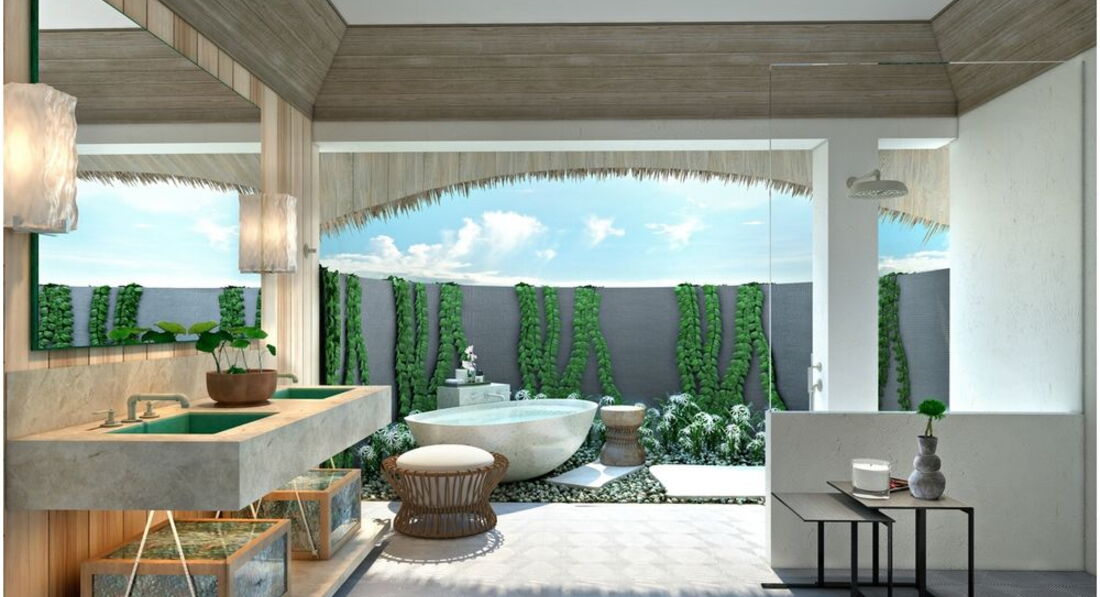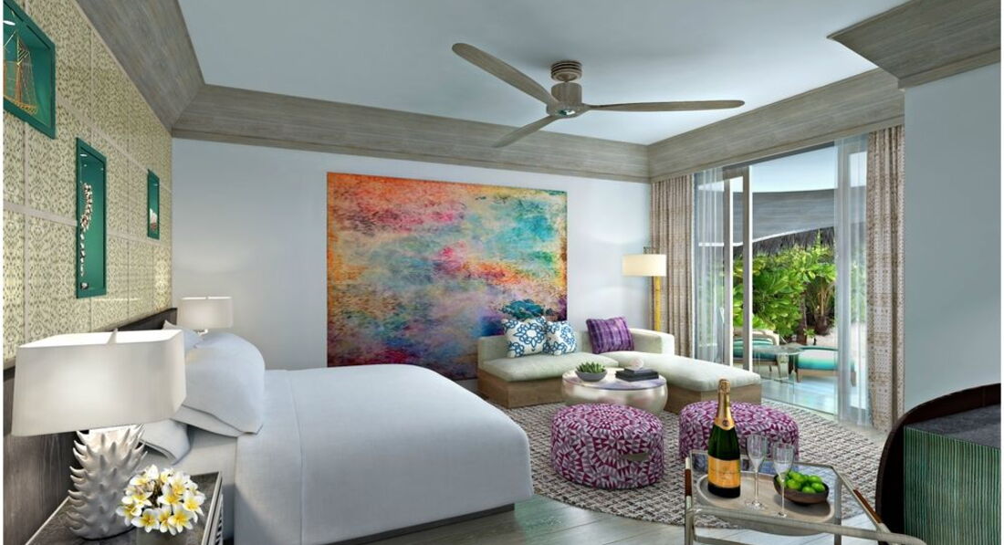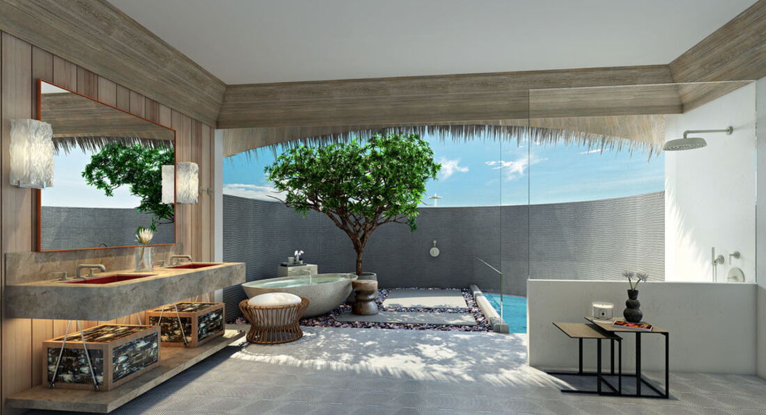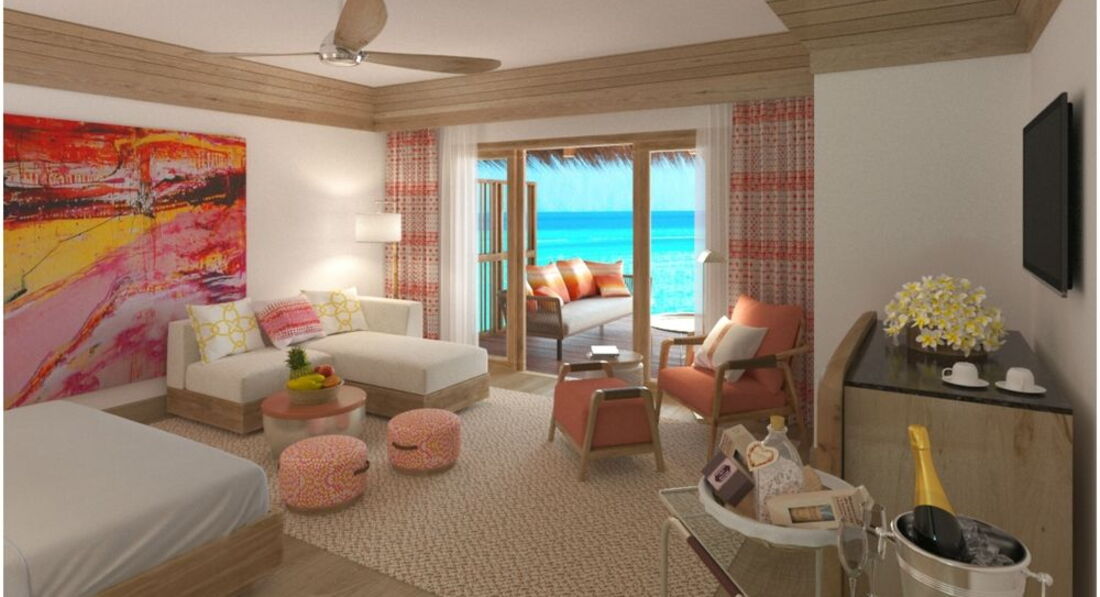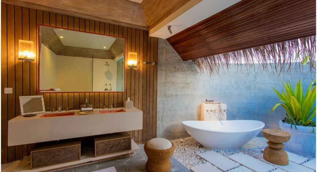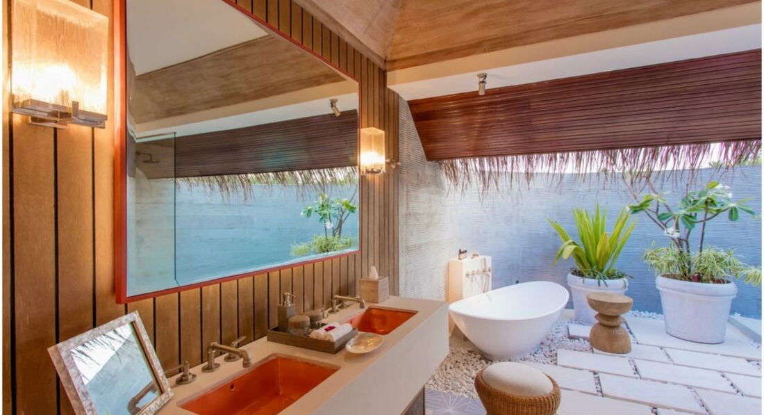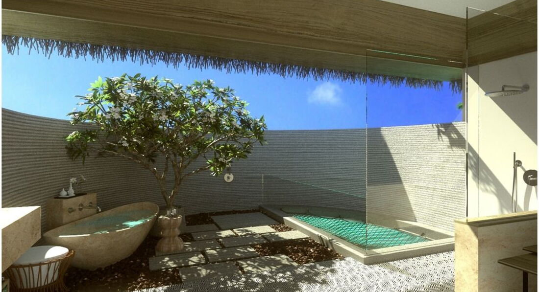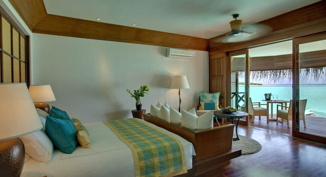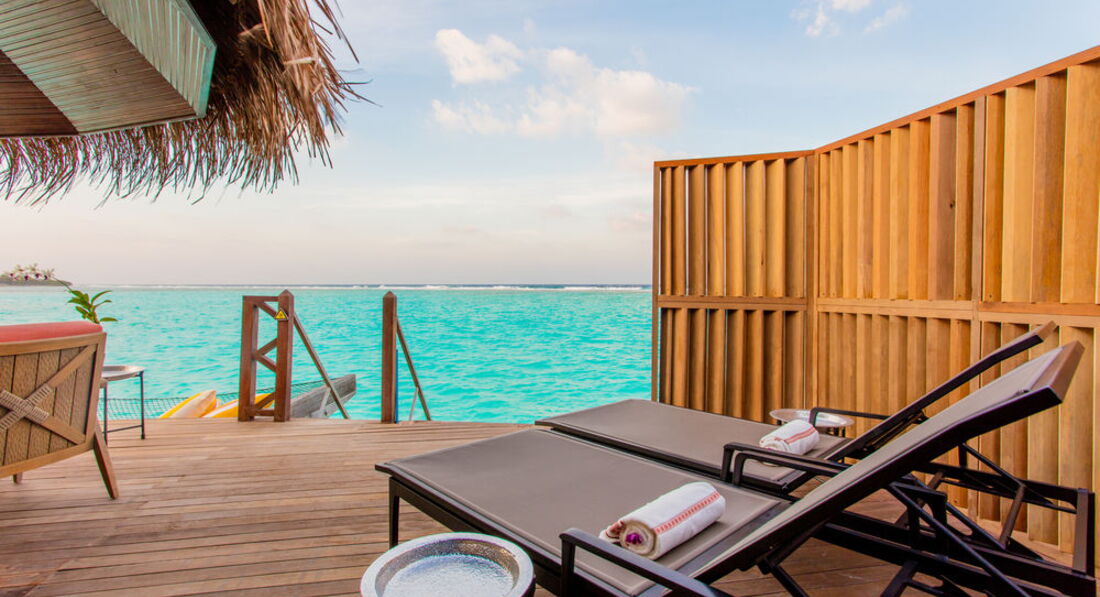2 Grand Water Villa (135 м2, макс. 2 чол.). Розкішні водні вілли, що стоять на палях у лагуні: спальня, вітальня, ванна кімната просто неба з ванною і душем, простора тераса, гамак над водою.