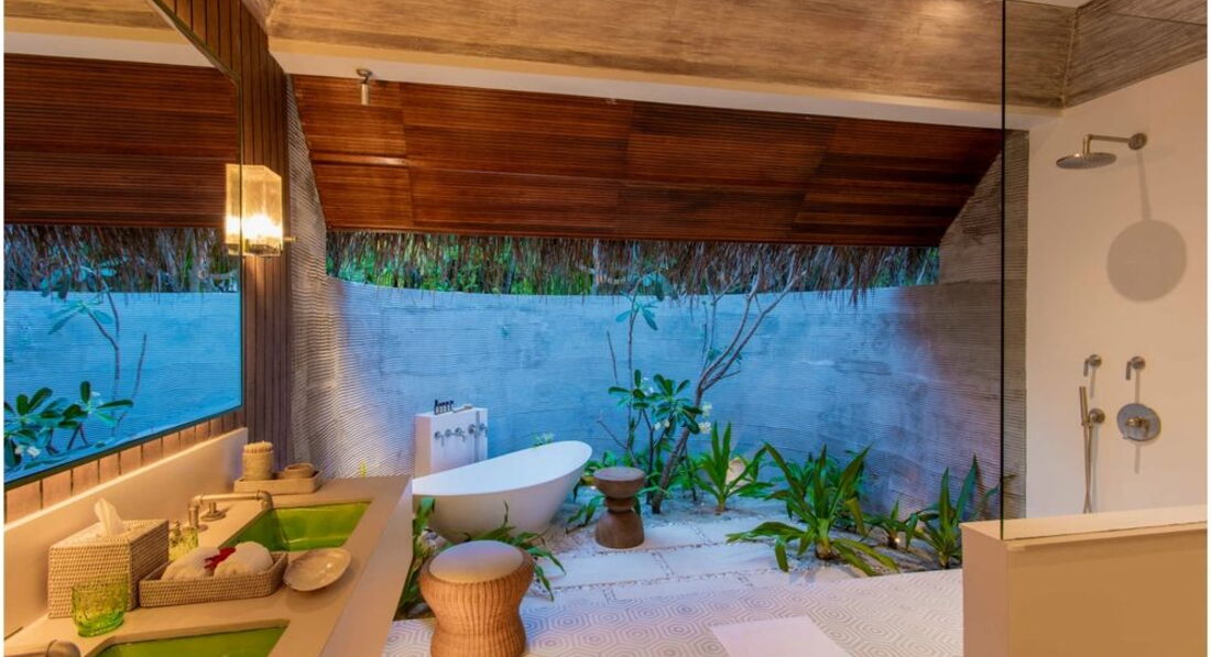 18 Water Villa (125 м2, макс. 2 чол.). Водні вілли на палях, з'єднані з берегом і між собою дерев'яними містками: спальня, ванна кімната просто неба з ванною і душем, тераса з шезлонгами, прямий спуск у воду.