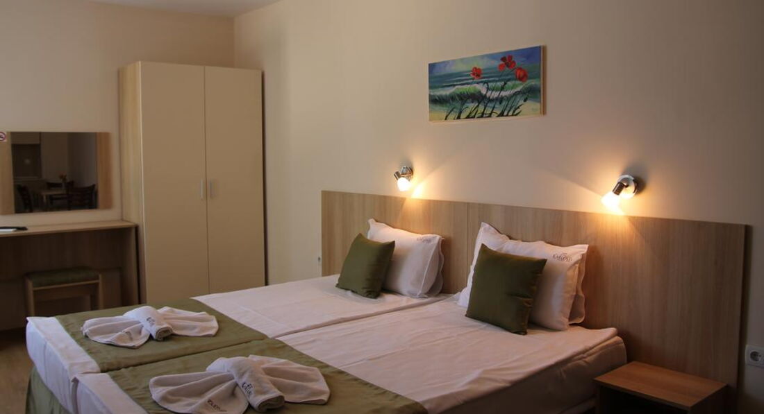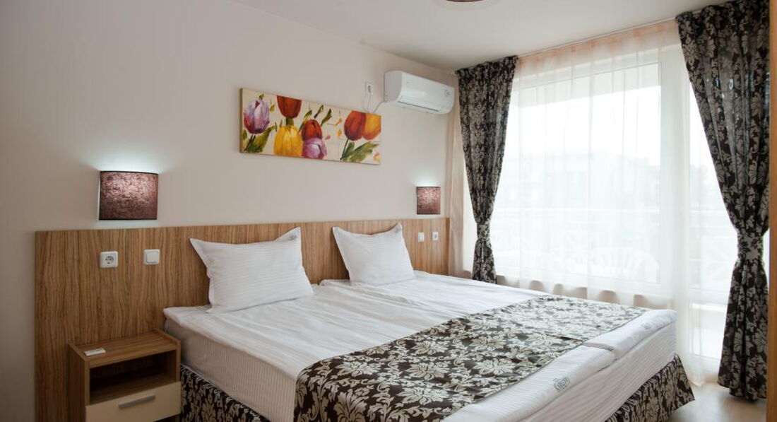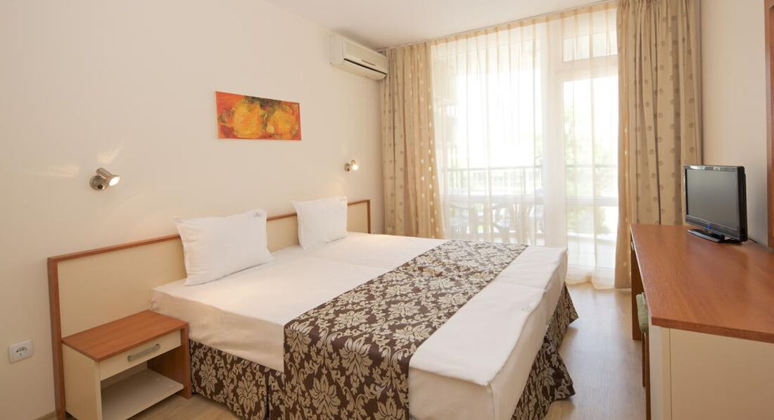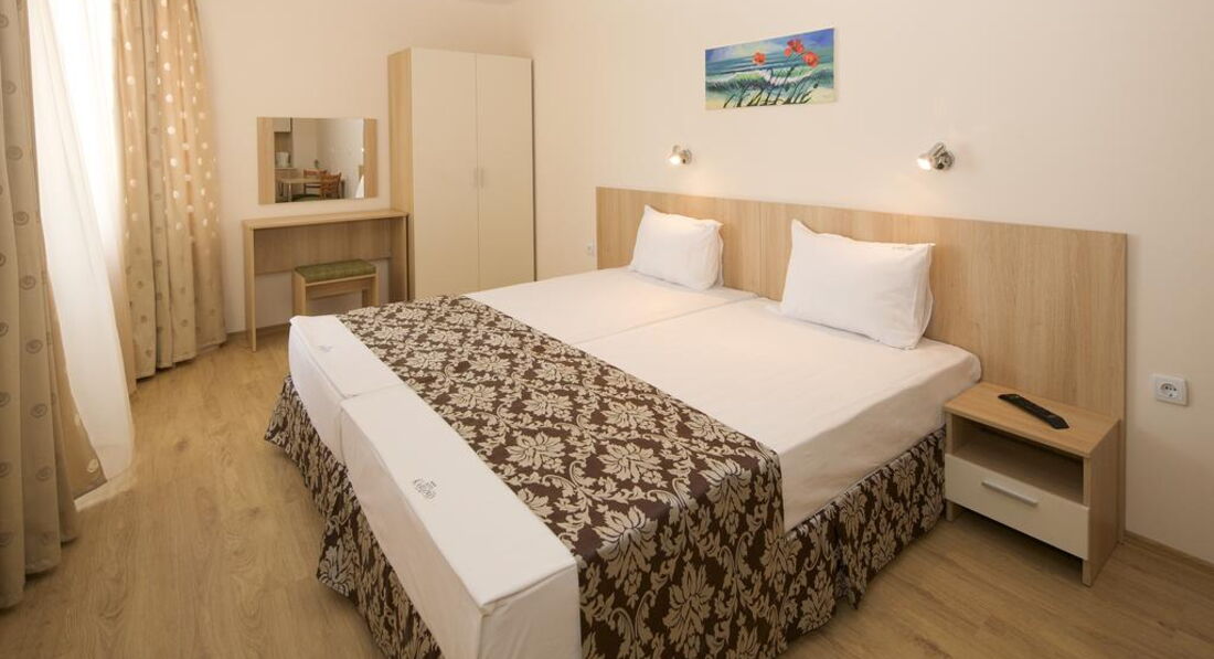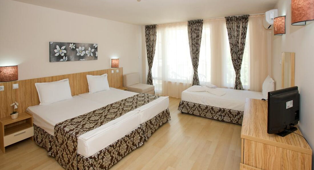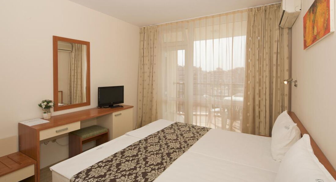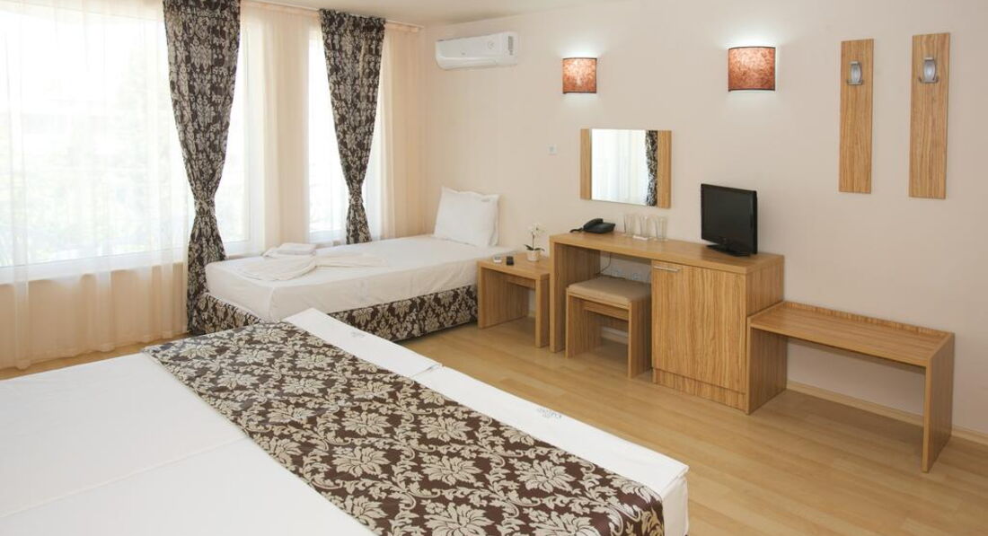 Отдыхали вдвоем с девушкой в июле, отель достаточно не плохой чисто и уютно, но дороговат. Месторасположение довольно удобное все ,что нужно рядом. Еда на твердую 4 ,для отеля со звездой 3 вполне неплохо. До моря минут 10-12 сам пляж оставляет желать лучшего...Море несколько дней вообще было очень грязным и цвело...Были в Бургасе там море лучше ...
