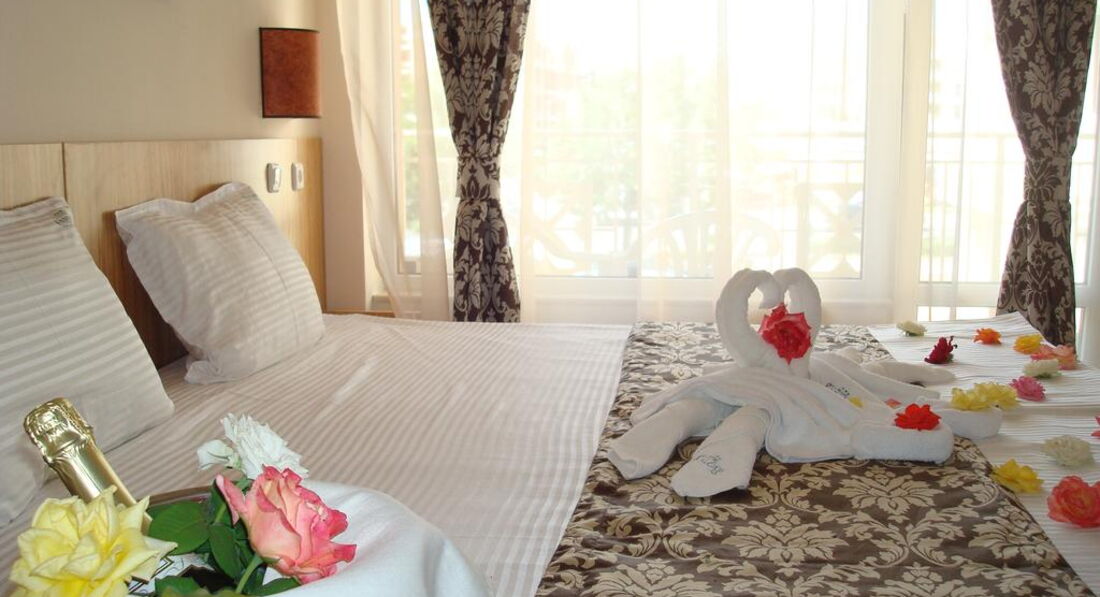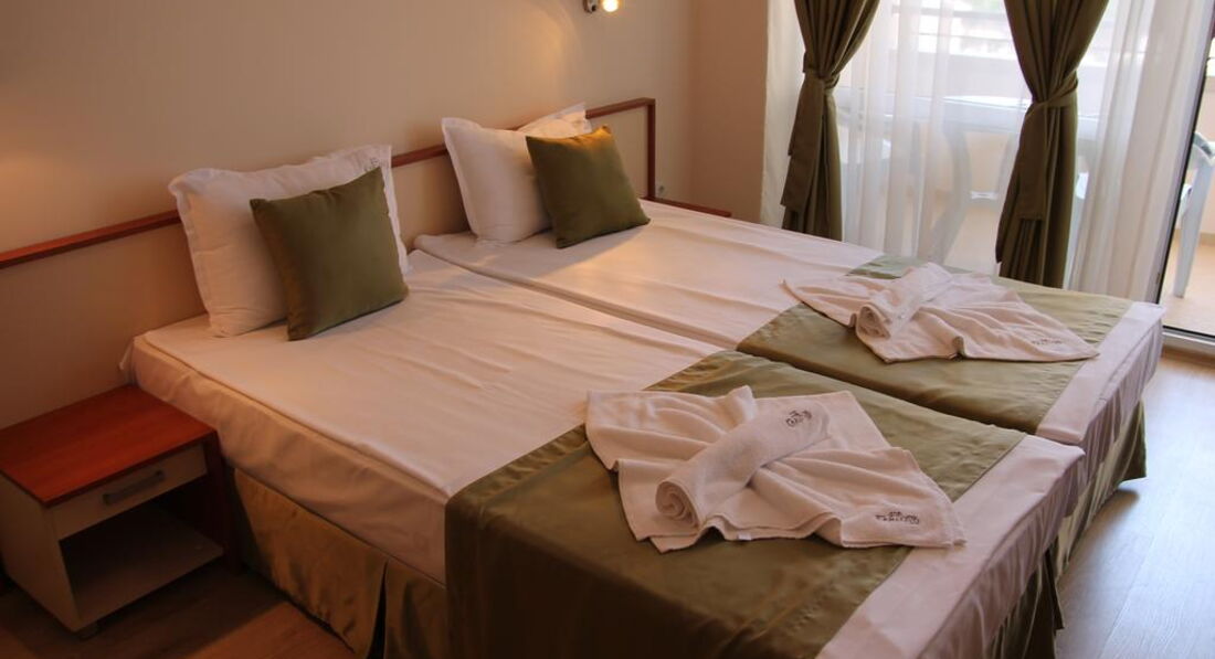 Прекрасный отель в центральной части курорта Болгарии, экстерьер - недалеко от центральной улицы курорта и вблизи моря (5 минут прогулочным шагом). При въезде нас встретили на рецепции очень приветливо, прибыли мы в 3 часа дня и опоздали на обед, но нам вежливо управляющая отелем предложила перенести этот обед на день убытия из отеля ( у нас было питание FB), было приятно..по какой то ошибке нас разместили изначально не в тот номер, но после исправились и разместили нас в наш оплаченный номер и извинились ( и это был всего 1 немного неприятный момент за неделю отдыха в отеле). Номер был просторный и чистый! постельное белье белоснежное и чистые полотенца(на 1 персону по 2 полотенца) с эмблемой отеля, в ванной комнате туалетные принадлежности(шампунь и гель для душа, мыло,белоснежная туалетная бумага). в номере убрали каждый день: мыли полы, выносили мусор и протирали пыль на мебели, застилали кровать), смена белья 1 раз в 5 дней, смена полотенец- раз в 3 дня, вполне достаточно.персонал очень приветливый, доброжелательный, семейная обстановка царит в этом отеле. Завтраки, обеды и ужины- очень вкусные!!!