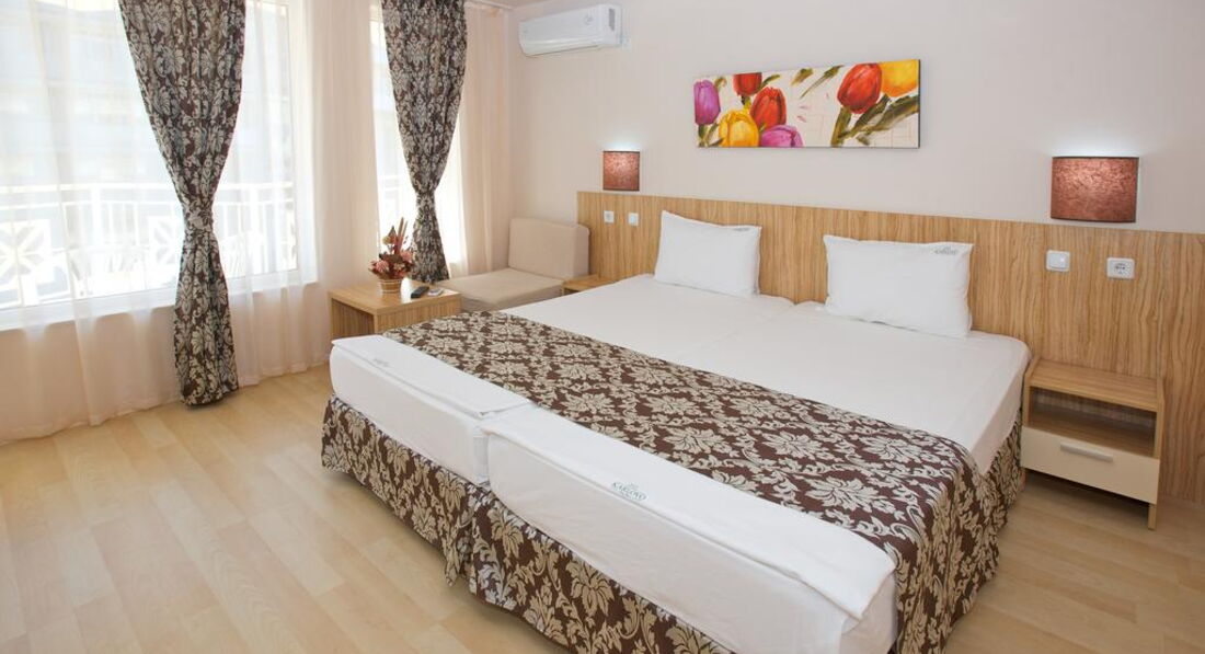 если устранить маленькие недостатки_ето 2% _от ста_то отель тянет на 4*,, нам все понравилось,на рецепшине встречают с улыбкой,и по любому вопросу помогут. мы приезжаем второй год подряд в етот отель. в номерах убирают вовремя,часть отеля_комнаты на двоих _просторные,а вторая часть_новая_еще просторнее_по две комнаты _и на проживание заселяют по двое_ да,есть где разогнаться. расположен отель_по серединке_;5_7 минут до пляжа,и также в самый центр _солнечного берега.у басейна _уютно,шезлонгов хватает_да и дороги прикрыт.воодщем_любите движение_для карлово_норм.