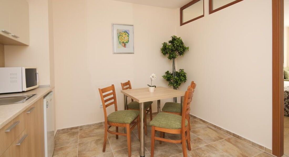 Two bedroom apartment - дві окремі спальні з двома односпальними ліжками в кожній та розкладним кріслом в одному з них, невелика вітальня з кухонним куточком з мікрохвильовою піччю, електрочайник, посудом, холодильником та обіднім столом з чотирма стільцями, з суміжними дверима, ванна кімната кабіною, макс. 4 дор. + 1 дит., 70 м2.