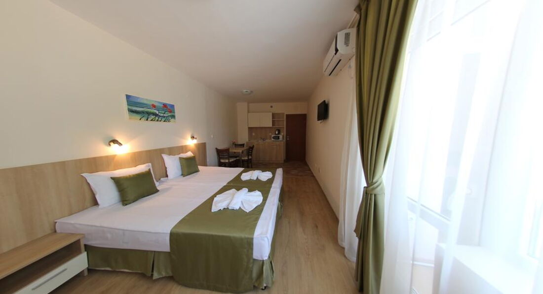 Тур оператор Лабиринт (в Болгарии GO2HOLIDAY). До отеля добрались оперативно, трансфер организован хорошо. В отеле нас очень радушно приветствовала администратор отеля, рассказала об основных организационных моментах, хотя время было уже примерно 9 вечера. Поселились мы в двухкомнатных апартаментах на 3м этаже (номер А3). Номер очень чистый и уютный. Окна выходят на центральную улицу, первую ночь шум улицы немного мешал, но потом мы привыкли. Номер убирали регулярно, мыли пол каждый день. Мыло-ресурс не возобновляемый.