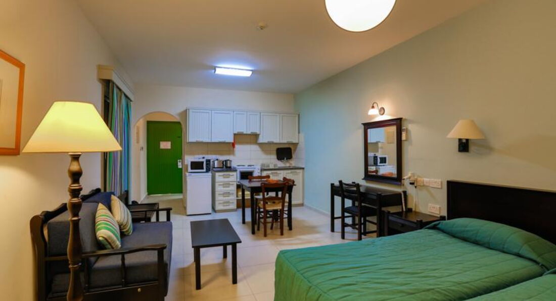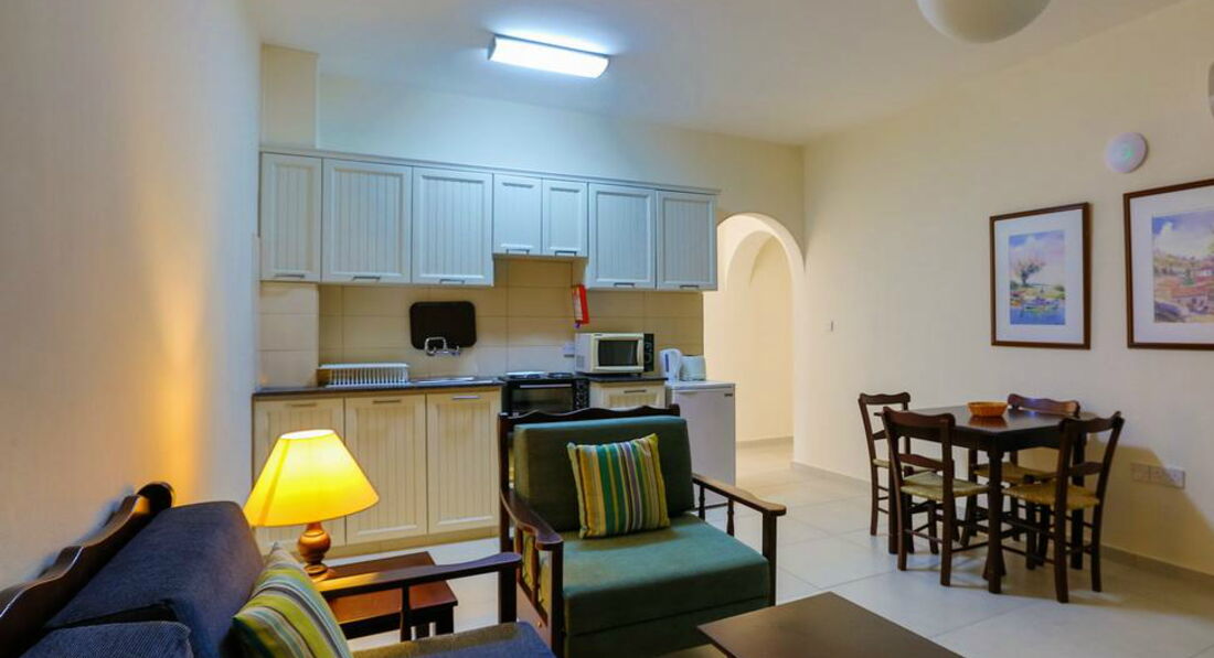 One Bedroom Inland View Apartment (45 м2, макс. 4–5 чол., двокімнатний номер з окремою спальнею та вітальнею, поєднаною із зоною кухні, у спальні два односпальні ліжка, у вітальні диван-ліжко, додаткове спальне місце – диван-ліжко; балкон або тераса з видом на внутрішній двір),