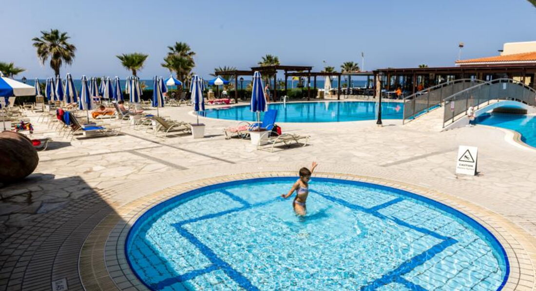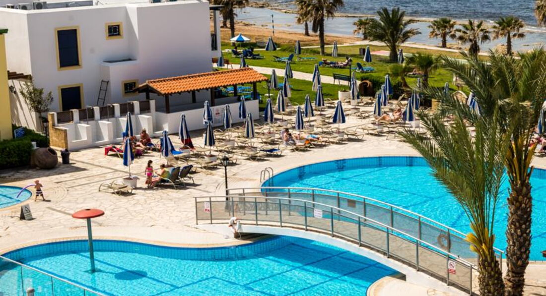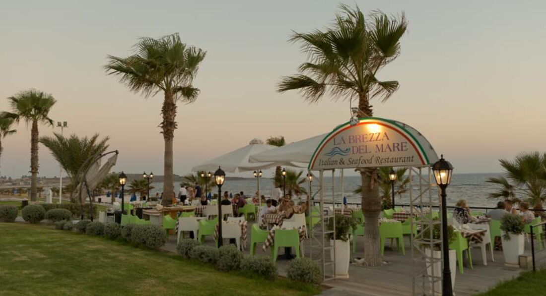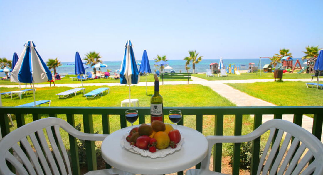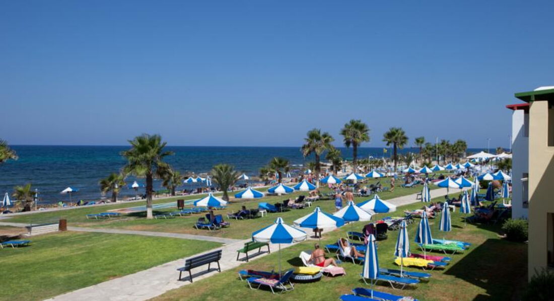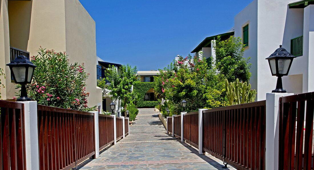 Знаходиться на березі моря. Відмінний вибір для сімейного відпочинку, у тому числі з маленькими дітьми. Підійде для тривалого проживання – у номерах повністю обладнана кухня. Велика красива територія із затишними будиночками-бунгало. Неподалік від нього знаходяться водний парк «Афродіта», міський маяк, порт, церква Святого Павла та Некрополь. Поруч зупинка автобуса до центру міста 2 км, пляж через дорогу. Вхід у море кам'янистий, є невелика частина піщаного входу, рекомендуємо захід із пірсу.