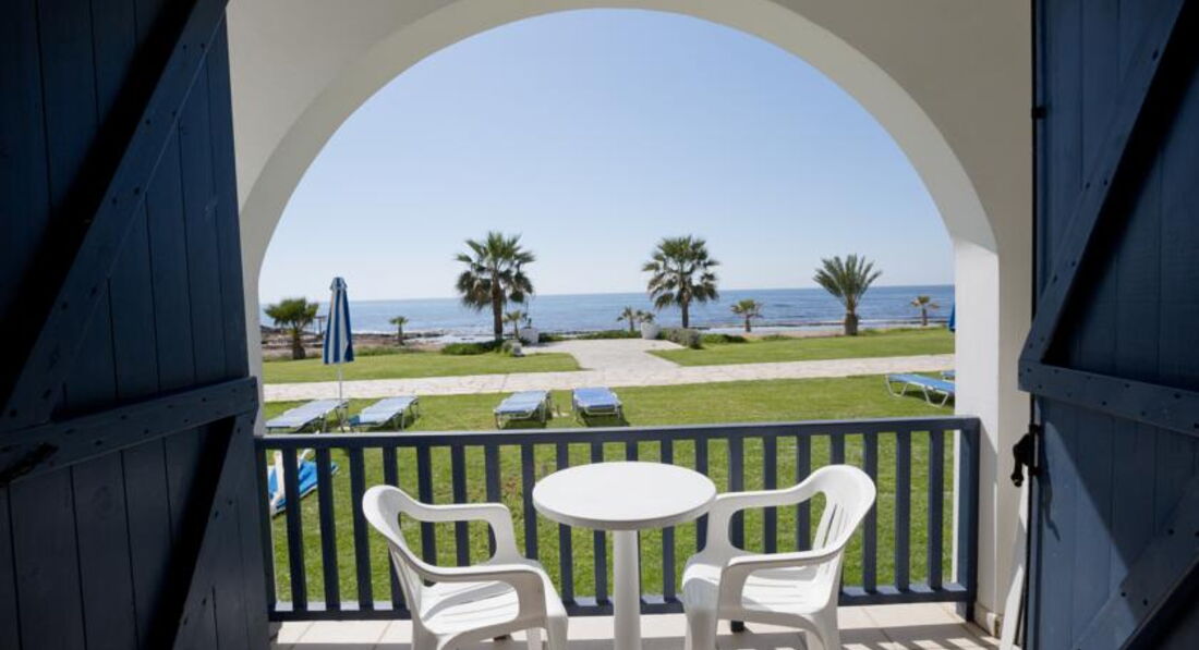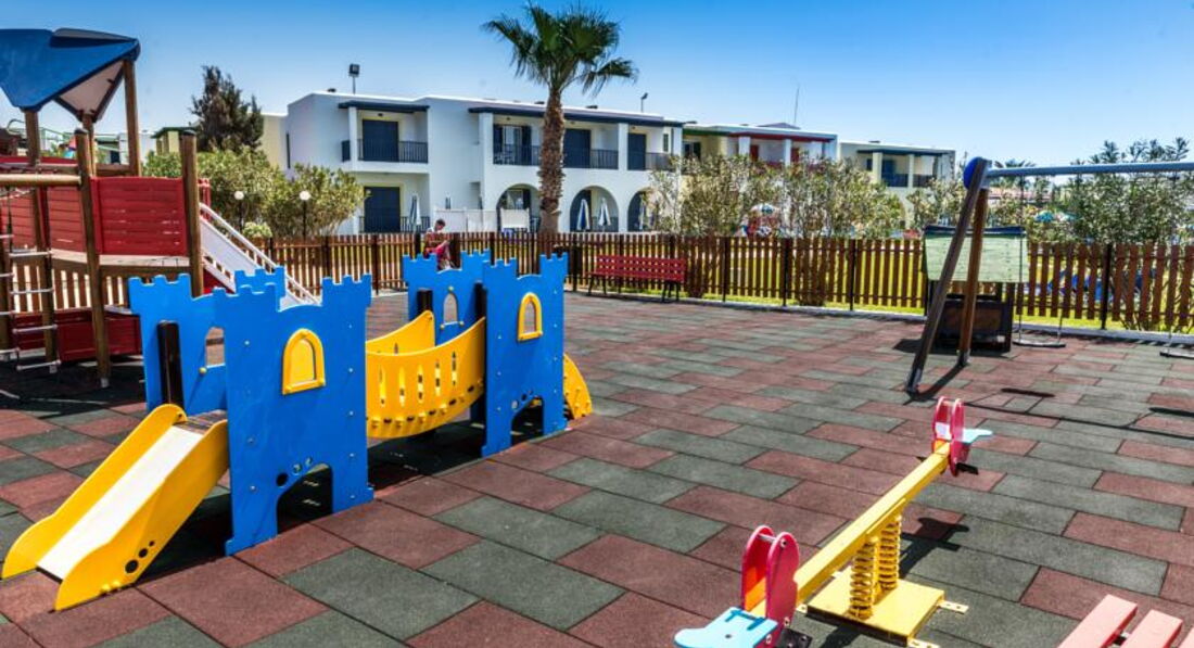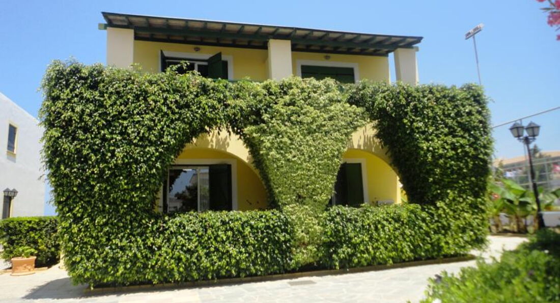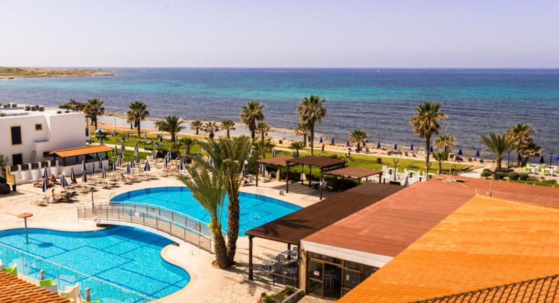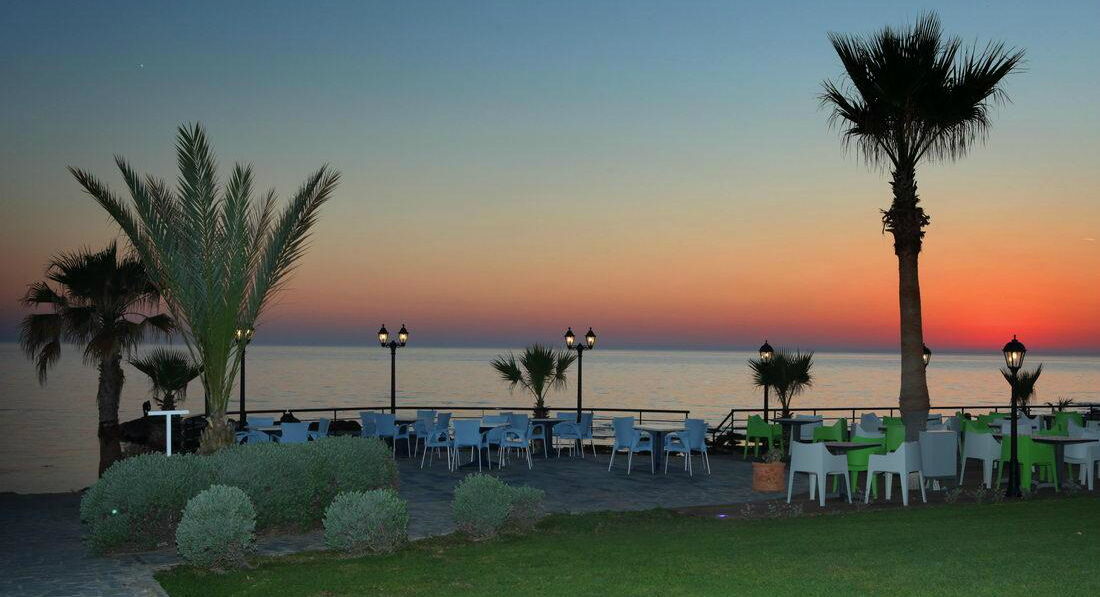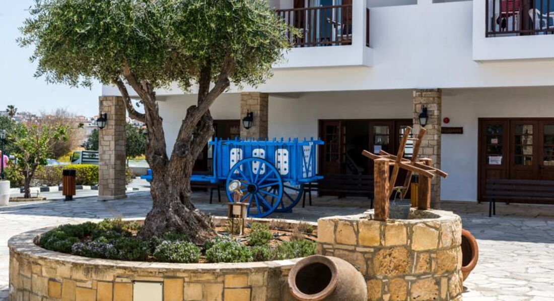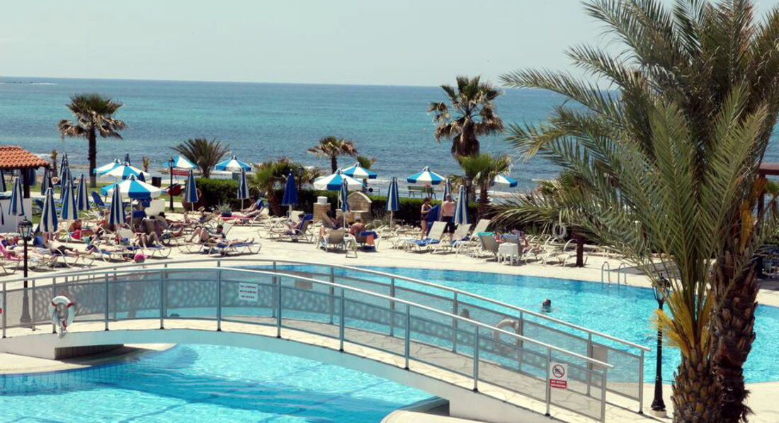 Знаходиться на березі моря. Відмінний вибір для сімейного відпочинку, у тому числі з маленькими дітьми. Підійде для тривалого проживання – у номерах повністю обладнана кухня. Велика красива територія із затишними будиночками-бунгало. Неподалік від нього знаходяться водний парк «Афродіта», міський маяк, порт, церква Святого Павла та Некрополь. Поруч зупинка автобуса до центру міста 2 км, пляж через дорогу. Вхід у море кам'янистий, є невелика частина піщаного входу, рекомендуємо захід із пірсу.