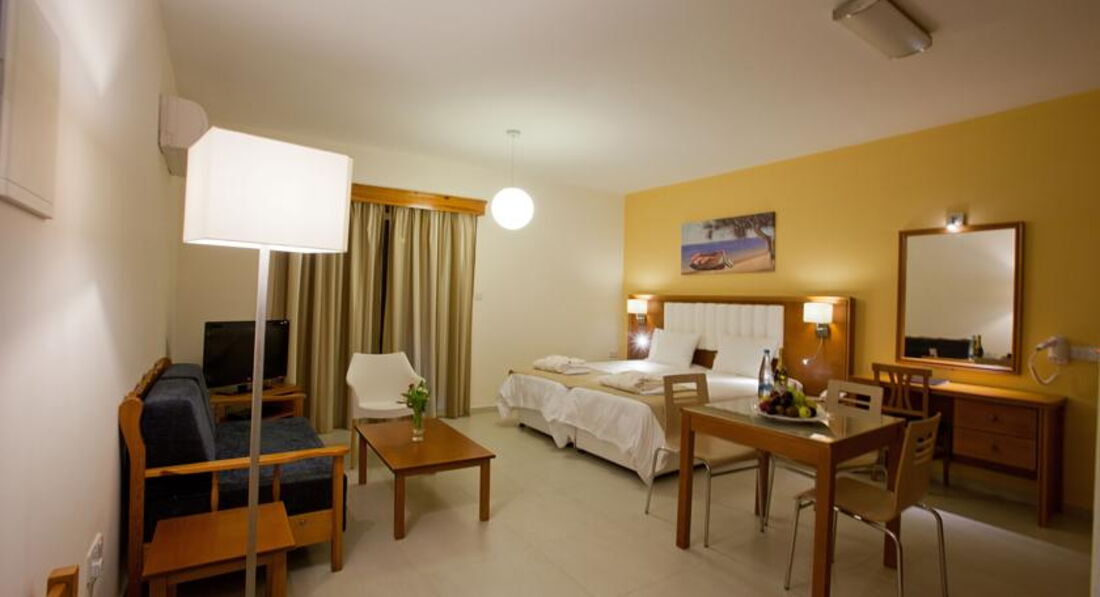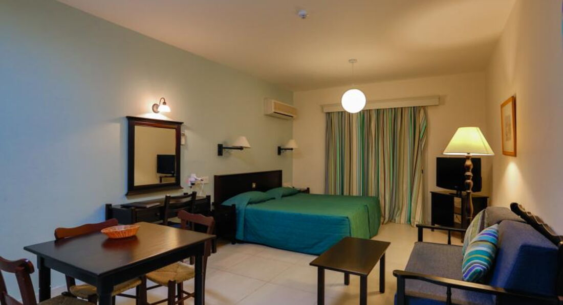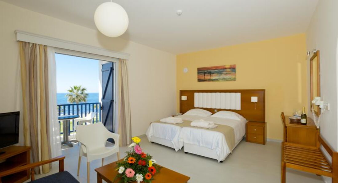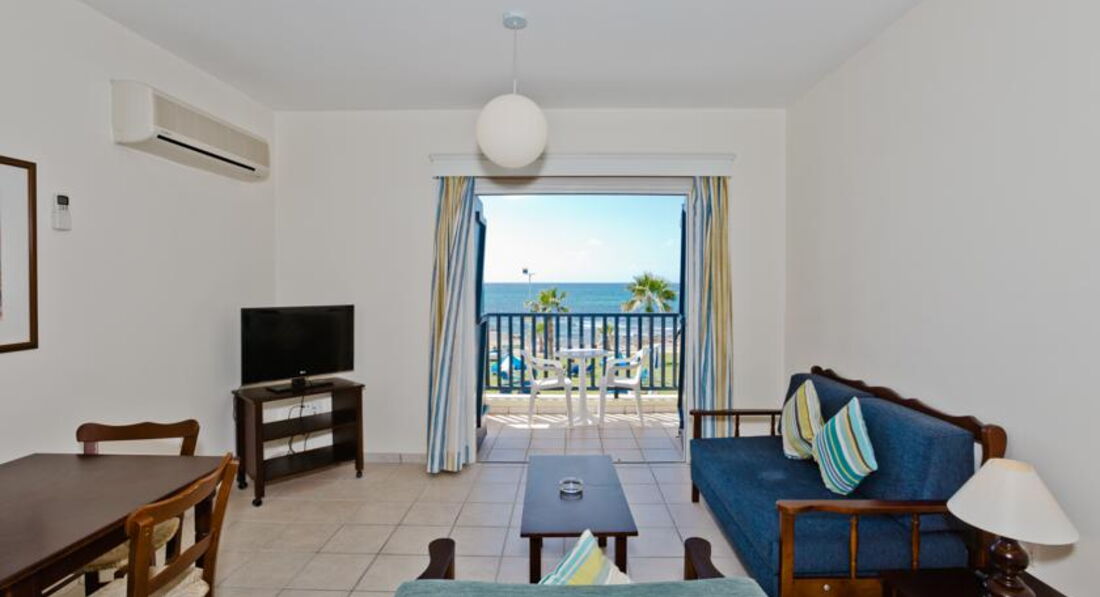 One Bedroom Superior Sea View Apartment (45 м2, макс. 4–5 чол., двокімнатний номер з окремою спальнею та вітальнею, поєднаною із зоною кухні, у спальні два односпальні ліжка, у вітальні диван-ліжко, додаткове спальне місце – диван-ліжко балкон або тераса з видом на море, фрукти, вода, вино – після прибуття, халати, капці, кавоварка, в номерах нові сучасні меблі).