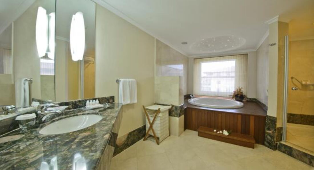 • 18 двокімнатних Deluxe Suite with Jacuzzi (вітальня, спальня з дверима, ванна кімната з джакузі та душ, макс. 4 чол., 73–86 м2)