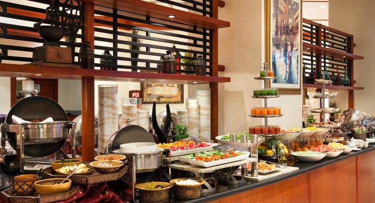 Кухня, на мой взгляд, так себе. Завтраки нормальные, стандартные для пятерки, то есть имеется свежевыжатый сок и лосось, однако шампанского не подают. Ну, да в арабской стране оно не принято. Брали полупансион. Питались на шведском столе. Устроен он неудобно. Те, кто сидят на террасе, вынуждены ходить к раздаче через тамбур из двух дверей. Соответственно те, кто сидят внутри, вынуждены через тот же тамбур ходить к грилю. Еда часто была пересолена, ассортимент небольшой. В понедельник, когда шеф-повар отдыхал, на ужине были откровенные доедашки. Ни в одном из ресторанов отеля скатертей на столах не наблюдала. Пластиковые столики и плетеные стулики. По ассортименту, качеству и оформлению этот шведский стол даже близко никак нельзя сравнить со шведским столом Глория Палас Рояль на Гран Канарии. Да и в Хилтонах, в которых нам довелось бывать, повара гораздо лучше. Наши снобы ругают Египет, но даже там местами кухня бывала лучше.