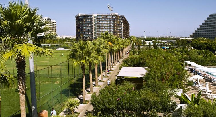 Территория отеля большая: сам отель протяженностью 200-250 метров, затем два футбольных поля - это еще 250 метров и пляж метров 30 шириной. На территории три больших бассейна, теннисные корты, виллы.