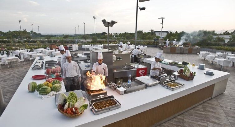 Бари та ресторани: головний ресторан розрахований на 1200 осіб (критий, з кондиціонером, літня тераса, дитяче меню, дієтичне меню, дитячі стільці), лобі-бар (24 години), бар біля басейну (10:00-24:00), бар на пляжі (10:00-24:00), диско-бар (23:30-02:00), вітамін-бар (10:00-17:00) та ін. 3 ресторани A la Carte: італійський/середземноморський , далекосхідний, латинський - відвідування одного з ресторанів безкоштовно 1 раз за час проживання за попередньою резервацією.