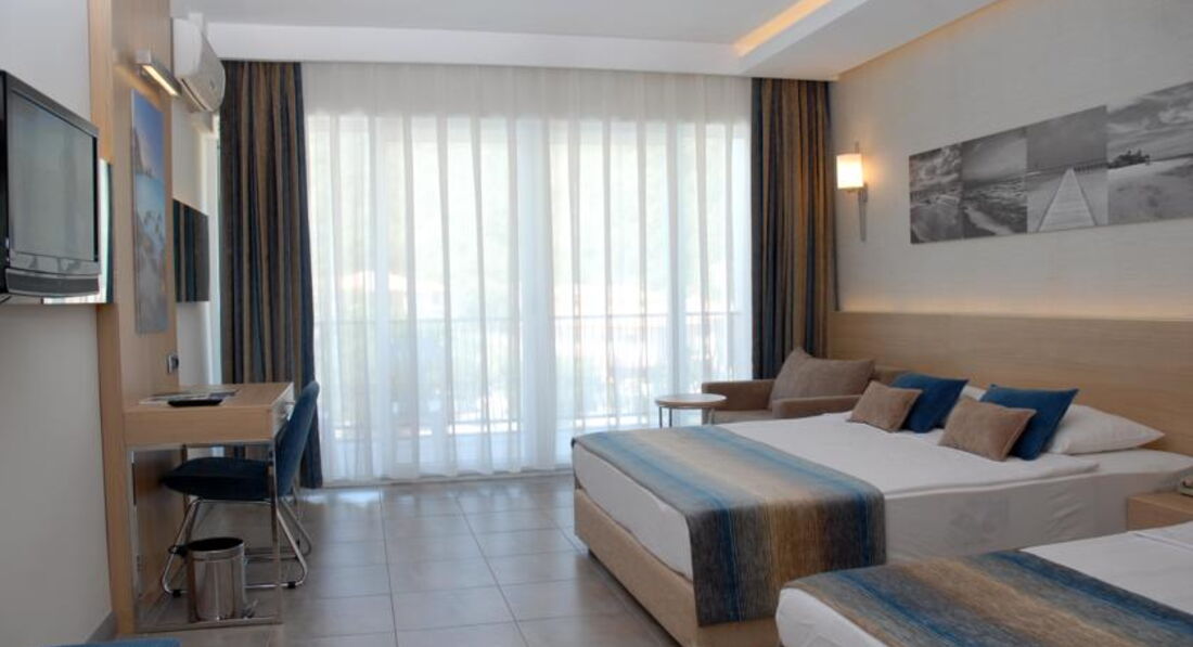 Отдыхали с мужем в этом отеле с 6.06-15.06 ехать из аэропорта Даламан 2 часа примерно.Приехали вечером-заселили сразу в просторный номер на втором этаже,номер светлый с хорошим ремонтом.Номер убирали каждый день.Отель нам понравился,питание хорошее-всегда находили что поесть(еда за 10 дней не надоела).Алкоголь в баре с 10 утра до 23 к алкоголю тоже нет претензий-все наливают в стеклянные фужеры и стаканы.Так же отмечу,что воду можно брать в любом количестве в бутылках 0,5.Сам город шикарный-есть куда сходить,что посмотреть.Мы бы вернулись в этот отель не смотря на отдаленность моря.Самый большой минус,то что летали Пегасом во первых сначала перенесли рейс из одного города в другой,так потом ещё и задержали в Даламан,а обратно наоборот вылетели раньше