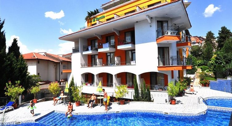 Хороший современный отель, расположенный в тихом местечки. Персонал отеля вежливый, неплохо говорит по руссски. В отеле есть небольшой магазинчик, обменный пункт, ресторан, бар, открытый басейн с шезлонгами и детский сектор(только он работает часов до 19 вечера), сауна, сейф. номера больший, там есть кондиционер, холодильник, телевизор, телефон, большая двуспальная кровать, тумбочки, стол, кресло, шкаф, туалет, душ. На балконе столик и два стула. Убирают номера каждый день. кормили хорошо, на завтрак яичница, сосиски, тосты, ветчина, различная нарезка, овощи, хлопья, джем, печенья, пиродки, фрукты, так же чай, кофе, соки и т.д. Море в 3-х минутах ходьбы (только через дорогу). Рядом с отелем супермаркет и автобусная остановка. В 10 минутах езды находится п.Св.Влас. До центра немного далековато, минут 15-20 на автобусе, там много различных ресторанов, кафе, развлекательных центров и дискотек (одной из самых больших является Гранд). В общем впечатление от этого курорта осталось весьма приятным!!!!