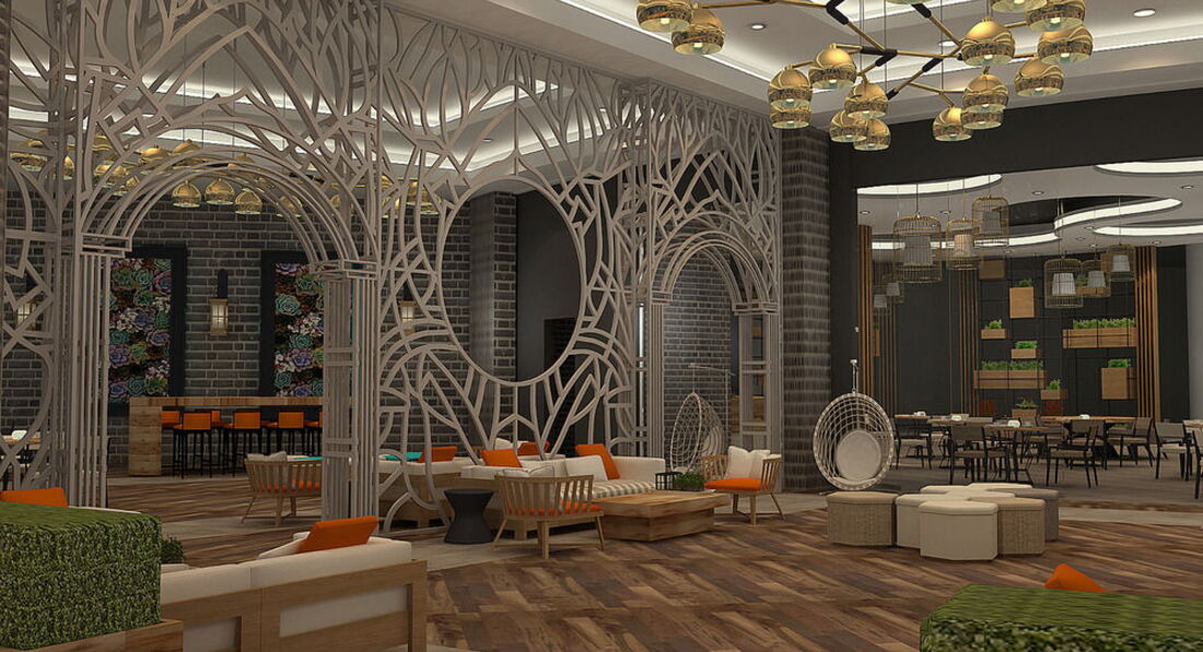 Отель выгодно выделялся своей дворцовой архитектурой, новизной на фоне других рядом стоящих отелей. Внутри, в зоне лобби удивились интересному дизайну в виде парящих чаек под куполом. Всё необычно-красиво и свежо.