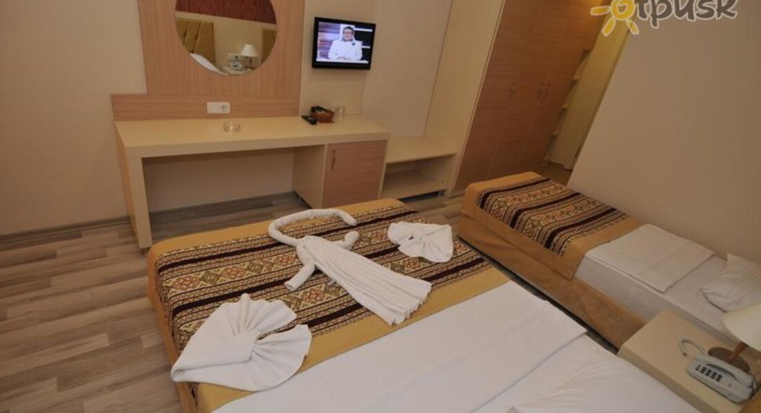 Отдыхали в отеле в июле 2016 года. В Турции были впервые, до этого 8 лет отдыхали в Египте. Понимали, что едем в бюджетный отель, поэтому многого не ждали. Но нам в отеле понравилось. Номера соответствуют фотографиям на сайте. В номере всё работало, горничная убиралась хорошо. Жили на 3 этаже. Поначалу дали номер 207, но мне там мешала спать ночная дискотека, хотя дочка спала и ничего не слышала. Промучившись две ночи,утром попросила на ресепшен переселить в левое крыло. При мне посмотрели, что освобождается номер 217, сказали подойти после обеда. Когда возвращались перед обедом с моря, подозвали и вручили ключ.