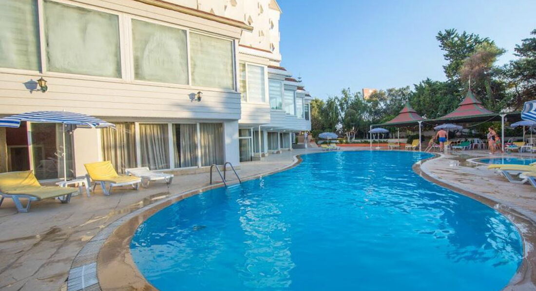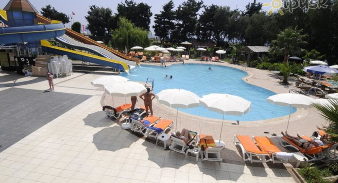 Отдыхали в этом отеле в конце мая-начале июня.Все очень понравилось.Заселили сразу по прибытии в отель,без всяких проблем и дополнительных "сборов",номер достался чистый ,без каких-либо "косяков"с видом на горы.Сразу проводили на обед.Первые два вечера было прохладно,зато потом погода была прекрасная и днем и вечером!Море уже было теплое,вход с пирса,что очень удобно,но и для неумеющих плавать можно отлично побулькаться возле берега.Минус-на море бар только с газированными напитками и кофе,чай...Питание очень понравилось,много фруктов-клубника,дыни,арбузы,апельсины,абрикосы.Часто давали вкусную рыбу.Из мяса только курица,но очень вкусная.Народу было в меру,всегда можно было найти свободный лежак на море.С бассейном ,правда,посложнее...кидали полотенце утром,когда шли на завтрак.Анимация была норм..сильно не приставали.Каждый вечер диско,народу там ,конечно,было мало,в основном турки и те,которых привезли из других отелей.Спиртное в отеле нормальное-мне понравился бейлиз,пиво.Номер убирали регулярно,крутили лебедей.(бесплатно).Вообщем отдых удался!!!