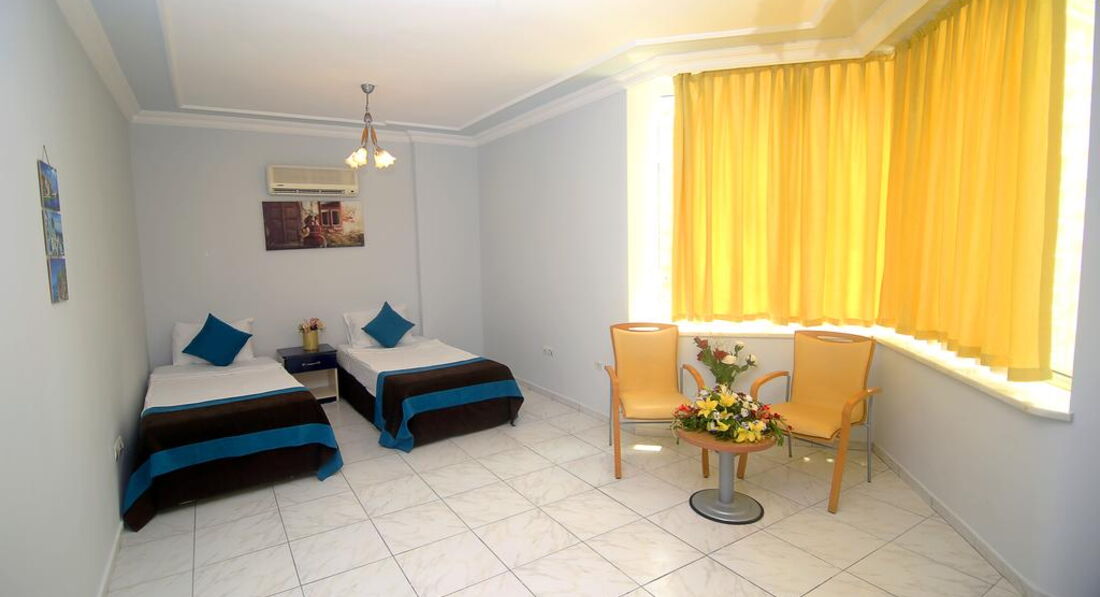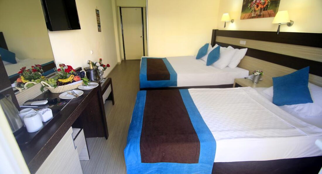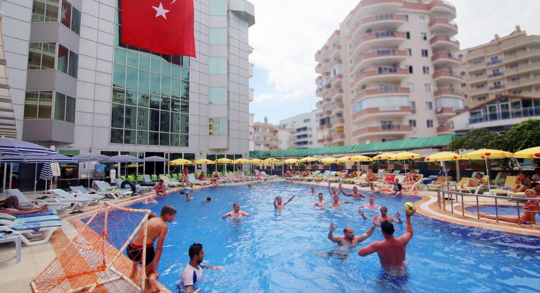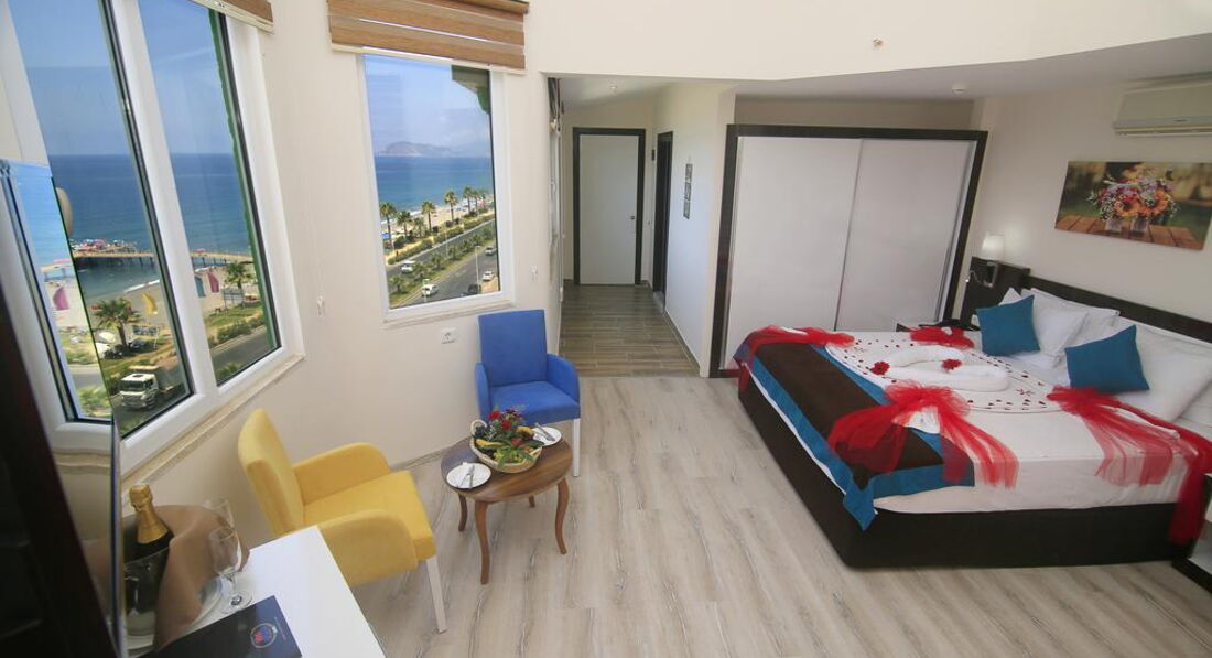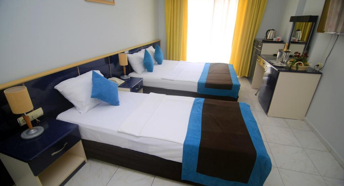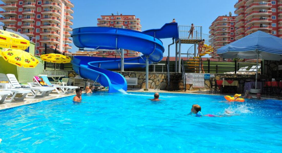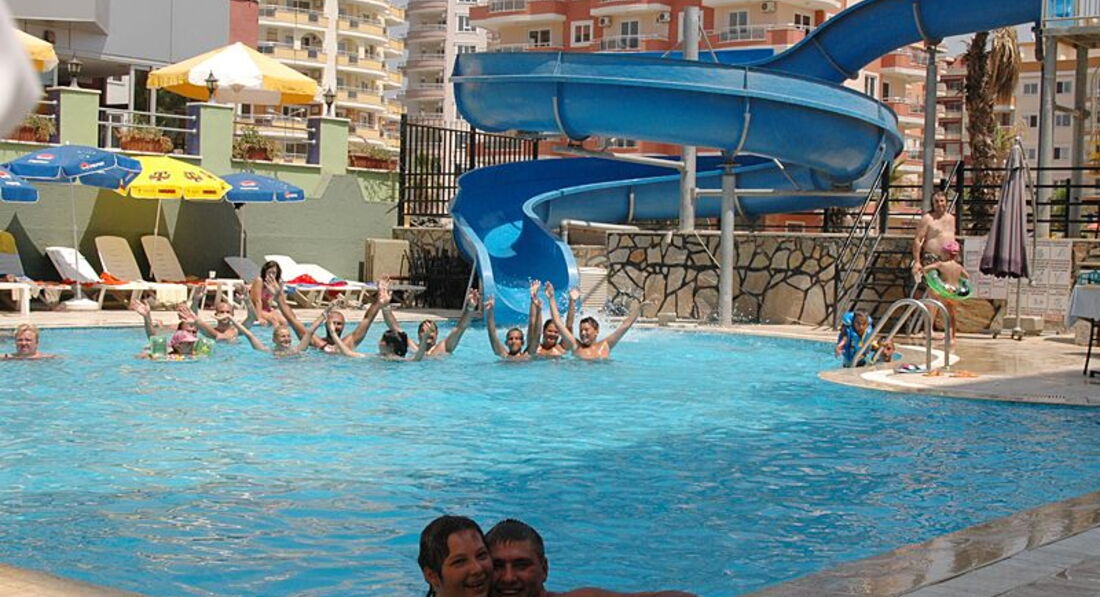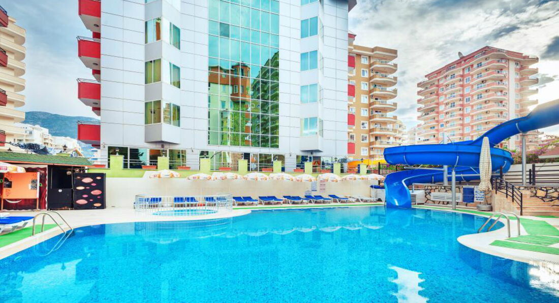 Только что вернулись из этого отеля, отдыхали с друзьями 11 дней. ЗАСЕЛЕНИЕ И НОМЕР. Заселили в отель быстро, номер достался на 3 этаже с боковым видом на море с балкона. Номер хороший, все чистенько, все работало, убирали номер каждый день, за незначительные чаевые крутили лебедей и всякие фигурки. Сейф в номере есть, но он почему-то платный. ПИТАНИЕ и НАПИТКИ. Один из главных плюсов этого отеля - это питание. Кормят очень хорошо для отеля 4*, и курица на гриле и множество овощей, гарниров и сладостей, маловато что фруктов только (арбузы, яблоки, слива). Стоит кофе машина можно делать любое хорошее кофе бесплатно, сладкие напитки типа юппи, кулер с обычной водой, спрайт, кола. Из алкоголя понравилось пиво, вполне достойное, а вот крепкий алкоголь не очень, пили джин иногда.ТЕРРИТОРИЯ.АНИМАЦИЯ. Территория отеля очень маленькая, но уютная, чистая. Есть столики где посидеть вечером, хороший бассейн с горкой, на ресепшене ловит вай-фай. Бесплатные напитки в том числе алкоголь в баре до 23.00. Анимация в этом отеле есть, но она очень слабая и не интересная, анимационное шоу вечером всего один час с 22-00 до 23-00, пару раз было интересно правда. Для детей детская дискотека 1 час в день. После 23-00 в отеле делать нечего, либо сидеть за столиками пить напитки или алкоголь успевший взять до 23-00, либо ложится спать, либо ехать на платную за 5 баксов дискотеку в Аланию, на которую зазывают целыми днями аниматоры, видимо они имеют с нее доход. На дискотеку ездили два раза. Один раз в клуб Гаванна другой в клуб Латино. В Гаванне можно потанцевать, достойный клуб, а вот Латино тихий ужас. Напитки в клубе стоят просто космос, поэтому если вы любите ходить в клуб под шафе ищите варианты. Люди выходят из клуба покупают пиво в киосках пьют и опять заходят в клуб, не понимаю политику администрации клубов, иметь сотни людей в клубе и покупают в баре из них 1-2 человека, зато соседние киоски рядом с клубами очень довольны. ЭКСКУРСИИ. Все экскурсии брали в лавке с права от отеля у Мустафы. Экскурсии в 3 раза дешевле чем у туроператора Пегас, и намного интереснее. Брали каньон-сафари, яхту и квадрики. Гиды туроператора как экстрасенсы впаривают людям экскурсии за сумасшедшие деньги, не видитесь. Еще гиды предлагают бесплатную поездку в торговый центр "максимарк", не ездийте это замануха и обман, это самый дорогой магазин в окрестности!!! Хорошие вещи, сувениры по оптимальным ценам в тц "Аланиум", до него за 1 бакс на городском автобусе. По субботам недалеко от отеля работает фруктовый рынок, там можно дешево купить фрукты и сладости. ПЛЯЖ. Пляж песочно-галечный очень рядом, с плохим заходом в море, но если не быть совсем привередой тихонько все заходят и купаются. Хороший экономичный отель, нам понравился.