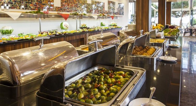 В ресторане шведский стол. Блюда на разный вкус: сырые овощи, салаты, овощи приготовленные, курица, мясо, котлеты, рис, макароны, картофель, супы, фасоль, арбузы, сливы, яблоки, виноград каждый день, иногда давали дыню, при мне два раза была рыба, было много еды национальной с приправами, разные десерты.