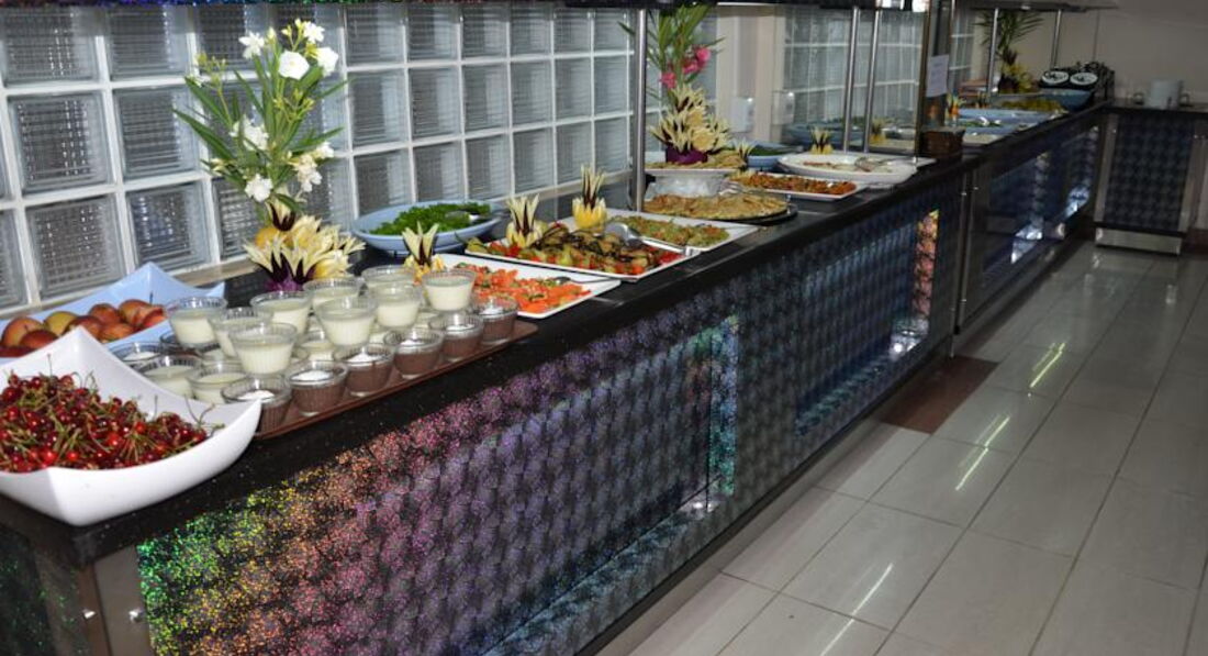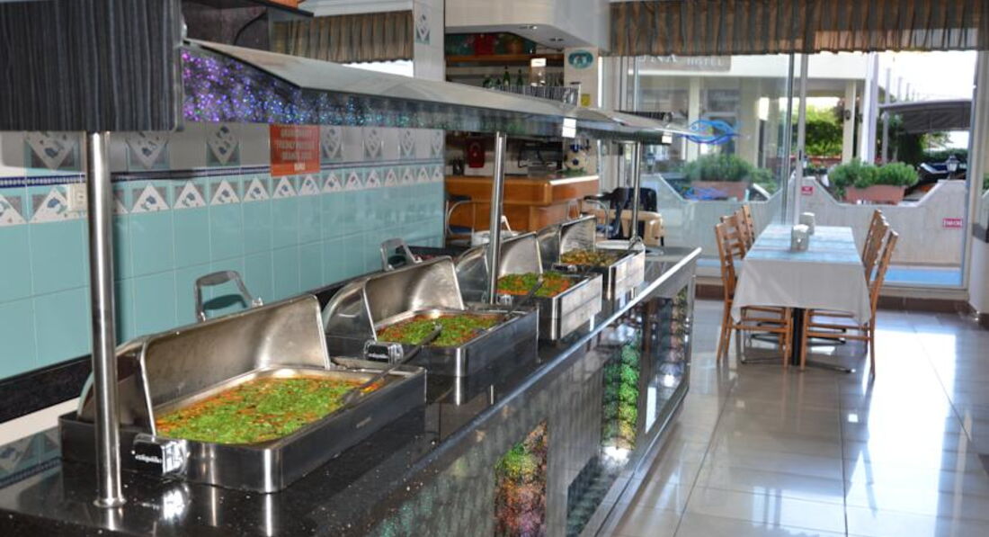 Отель 3*. Ни в каких других отелях я не отдыхала до сего времени. Впечатления новичка. Расположен отель рядом с морем, до пляжа 2-3 минуты. Это очень удобно. Лежаки и зонтики на пляже платные (в июле 2015 года - 5 $), в баре на пляже тоже все напитки платные. Бесплатно только в отеле и то, если берёте не в фабричной упаковке, а в розлив. Размещение в отеле понравилось: комната чистая (убирали каждый день), есть кондиционер, холодильник, фен, телевизор (нам не пригодился, т.к. все каналы на турецком и немецком яз.). Полотенца за всё время пребывания (1 неделя) не меняли. Русскоговорящих среди обслуживающего персонала нет. Учите англ. яз. или турецкий! О питании могу сказать так: с голоду не умрёте. Вкусный кофе в кофемашине. Завтрак с 7.30 до 9.30, обед с 12.00 до 13.30, ужин с 19.00 до 21.00.