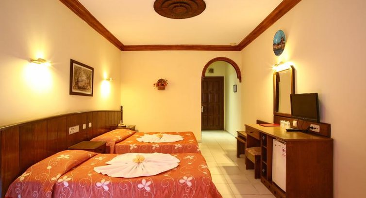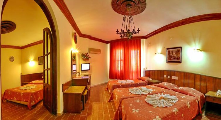 Нас по приезду сразу заселили (14.00) по местному времени, номер чистенький и приятный, бюджетный конечно, но мы не привередливые. В номере: 2 кровати, тумба,зеркало, стулья,что то типа маленького шкафа(пожалела, что не взяла с собой плечики для одежды, там было всего 5 шт.), холодильник, 2 тумбы. В ванной: ванна, унитаз, раковина, зеркало,фен(свой брать не рекомендую, т.к. электрика очень слабая, мой профессиональный фен не вывозил, вырубало все рубильники))В комнате 3 розетки. В ванной еще одна. Горячая вода была почти всегда, т.к. было достаточно жарко все 14 дней, ночью бежит прохладная. Уборка каждый день, про замену полотенца нужно напоминать. Убирались достойно, чаевых не оставляли. Мыло давали каждый день, шампунь и бумагу тоже.(шампунь как мыло жидкое)Единственное, что нас смущало, это вафельное полотенце, под которым мы спали, приятного мало. На балконе можно курить.Персонал очень дружелюбный, все действительно говорят по английски и немецки, по - русски никто((( Но это нам не мешало подружиться и расположить друг к другу. Мальчика на ресепшене зовут Мейси - молодой, энергичный парень, никогда не оставит в беде, всегда все подскажет. Номер был у нас №106, на первом этаже, рядом с ресепшеном - нас устроило.В отели сплошные немцы!!!! Кормят 3 раза в день, еще в 16.00 полдник, дают выпечку(мы ее почти не ели, не вкусная)На завтраки яйца, хлопья, овощи, их сыр и соевая колбаса)) На обед дают рыбу, курицу, баранину,рис (безумно вкусный), картошку и много овощей в разном виде. Мы объедались от души. Аппарат с кофе и соком есть, только сок сплошной юппи или зукко, еще он очень приторный, есть чай и молоко, кулер. Алкоголь конечно вообще кака, пиво горькое, вино только сухое, ну конечно все порошковое))Самое съедобной это джин, для любителей есть водка. Я особо не экспериментировала с алко, т.к. после вина у меня сильно болел желудок, поэтому с гастритом не рекомендую настоятельно. Мы брали алко с собой, нам его хватило. Из фркутов есть яблоки, апельсины и груши,местный фрукт, не помню название. Один раз давали клубнику. На уличной терассе бар и бассейн, в нем мы не купались, т.к. все дезинфицируют хлоркой, а у нас аллергия, да и в море куда приятнее на песочке. Море: море шикарное, в мае чуть прохладное, но мы купались - вполне комфортно.Лежаки платные - 5 баксов на двоих в день, бар есть, но дорогой, мы закупались в маркете(Мигросс)он рядом, туалет на пляже платный - 1 лира. Мы загорали и купались вдоволь до 18.00 вечера, потом солнце начинает садиться. В мае, кстати, солнце гипер активное, белокожие быстро сгорают. Вроде всего + 26, а солнце печет как в +45, так что купаться и загорать можно)))На плже работет Юсуф, очень забавный и смешной мужчина, мы с ним поладили быстро и общались на ломанном английском. В мае на пляже людей не много, лежаков хватает, много немецких нудистов, кстати талоны на пляж берите на ресепшене - будет дешевле. Обязательно посетите смотровую площадку на горе, крепость Кале, оттуда невероятный вид. Можно на 4 автобусе, мы ходили пешком. Посетите аквапарк, незабываемые очучения, особенно горка камикадзе)). Съездите на экскурсии : Помукалле(минеральные белые травинтины), очень красиво. Также посоветую храм святого Николая, прогулку на яхте до затонувшего города на острове Кекова. Хамам - отдельный разговор, очень круто...Можете не брать посещение у гида, а выбрать баню самост