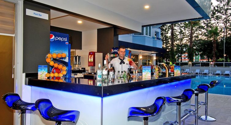 Бар на территории отеля один, обслуживают шустро, пиво пробовали и коктейли, нормальные, за другие напитки не скажу. Автомат с кофе работает бесперебойно, чай пакетированный, горячий шоколад есть. Холодные напитки тоже, айрана нет. Анимации нет, кому важно.За время нашего отдыха были турецкие танцоры(2 раза, одни и те же), живая музыка, огненное шоу. Мы в отеле не сидели, может и пропустили что. В городе есть куда сходить, были в крепости, в пещере, в музее, парках, в гавани и порту, в кафешках живая музыка и танцы живота, гуляя можно много интересного увидеть.