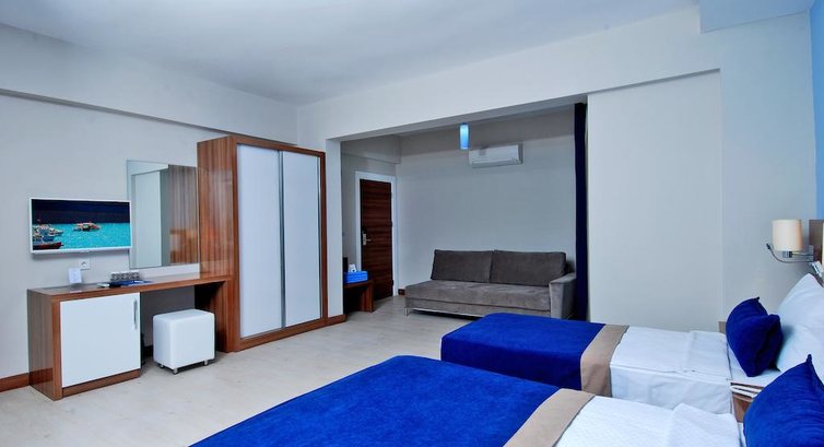 Отдыхали в Турции не в первый раз, в основном в четверках. Отель понравился во всем. Так как приехали после 15 часов, заселили сразу. Стандартные номера небольшие, но чистенькие и уютные. Большой балкон. Единственное, что несколько удивило это мыло 2 шт. было только когда заселились, так как оно очень маленькое, быстро закончилось, больше мыло не докладывали, мы покупали в магазине. Но это мелочи, номер убирали ежедневно, а мы и не мусорили собственно. Решили поменять номер, потому, что выходил окнами на бассейн, вечером очень шумно, а мы приехали отдохнуть и выспаться. Через два дня предложили другой номер, туда мы и переехали. Питание хорошее, мы не успевали проголодаться, все было вкусное и свеженькое. По утрам несколько видов очень вкусных булочек, это просто "засада", не могла от них отказаться и кушала с удовольствием. Замечательный повар по утрам готовил разнообразные омлеты и иногда блинчатые оладушки. Море соленое, прозрачное и очень теплое. Рядом с отелем спортивный комплекс с тренажерами, мы по утрам не каждый день, но занимались на тренажерах.