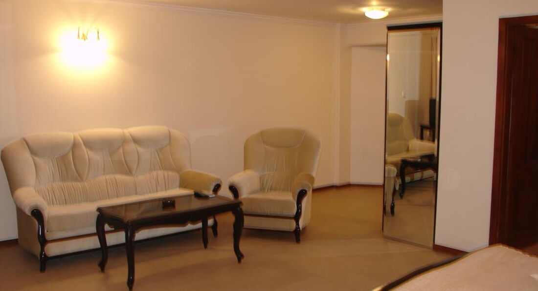 Отдыхали вдвоем с женой. Номер у нас был просторный: здоровенная двухспальная кровать, рядом с кроватью 2 тумбочки, мягкий, удобный диван, кресло, журнальный столик, трюмо, большая вешалка, шкаф с зеркалами, мини холодильник. Также был телевизор с 3-я болгарскими каналами и 1 русским, а также магнитофон (вообще не включали). Порадовал большой балкон, где мы иногда вечерами устраивали распитие вина. Санузел тоже достаточно большой со всеми необходимыми девайсами (большая душевая, фен). Уборку производили каждый день, белье сменили за 10 дней всего 1 раз.