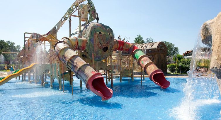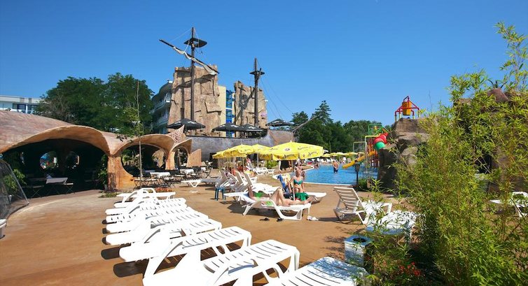На территории отеля несколько бассейнов - в одной части они,скорее, для отдыхающих без детей - можно расслабиться на лежаках с коктейлем (до 23.00 работает пул бар,у кого All inc - можно пользоваться. Между обедом и ужином там есть вкусняшки (мороженое - оооочень вкусное) и хот-доги). В другой части аквапарк - там раздолье как для детей, так и для взрослых) Там же есть ресторанчик, для тех, кто брал только завтраки - можно кушать, цены приятные - суп 3 лева(1,5 евро), салат 2 лева и т.п.