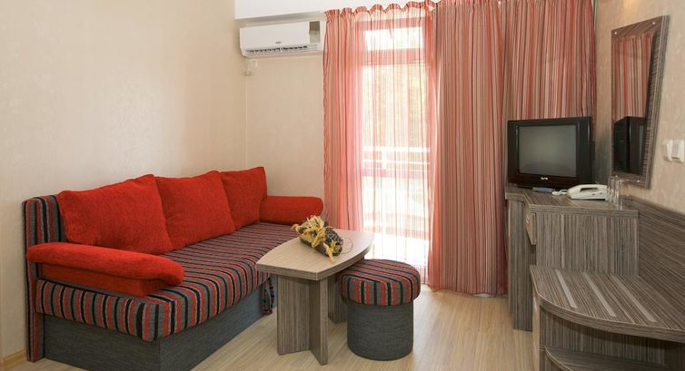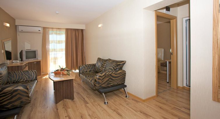 Отдыхали с детьми 3 года и 6лет. Прилетели утром, заселили в 12 часов.Номер на 4-х очень просторный,кровати удобные.Погода в день приезда была прохладной, прошел дождь,поэтому сразу на море не пошли.На следующий день было тепло,пошли на море,но вода была холодная.Брали с собой зонтик,т.к. зонты и лежаки платные.Через несколько дней море потеплело,несколько дней купались.Затем были ветряные дни,море штормило,принося к берегу много водорослей.Но нас спасал аквапарк, детям там раздолье.Ездили на паровозике в старый город и центр солнечного берега. Аниматоры молодцы развлекали детей по полной программе. В ресторане каждый день несколько мясных блюд и рыба.много фруктов: арбузы,киви,персики,абрикосы,яблоки,грейфрукты,апельсины.Рекомендую этот отель для отдыха с детьми.
