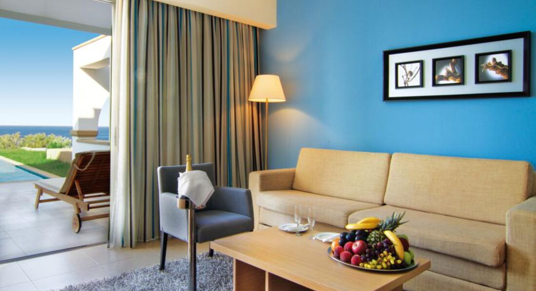 suite SV (вид на море, спальня та вітальня з дверима, осн. ліжко – 2 односпальні, дод. – 2 софи, 2 ванні кімнати, макс. 3+1, 55 м2).