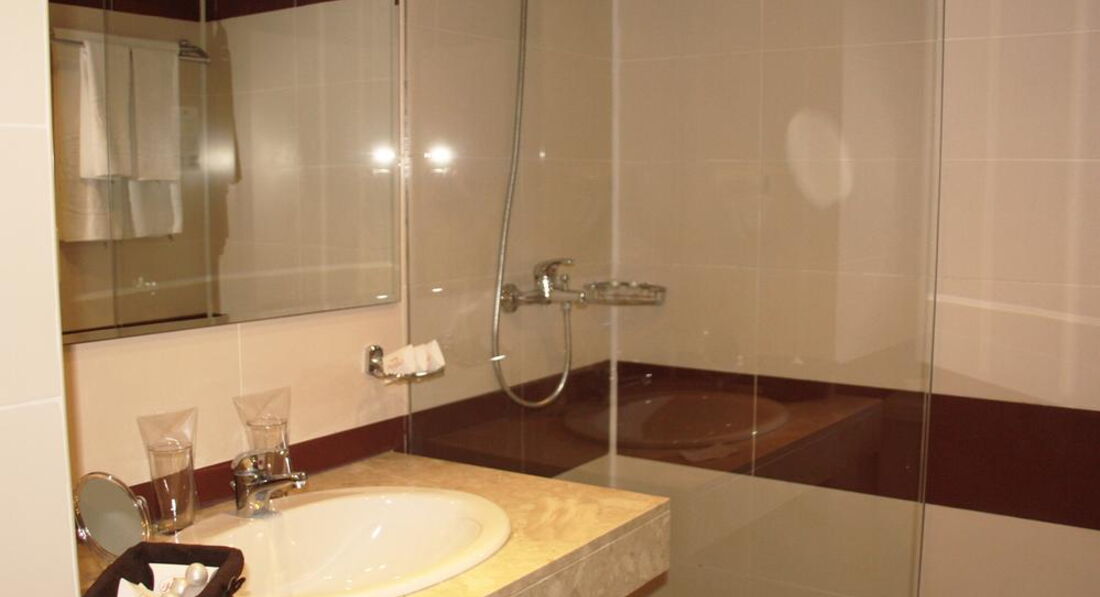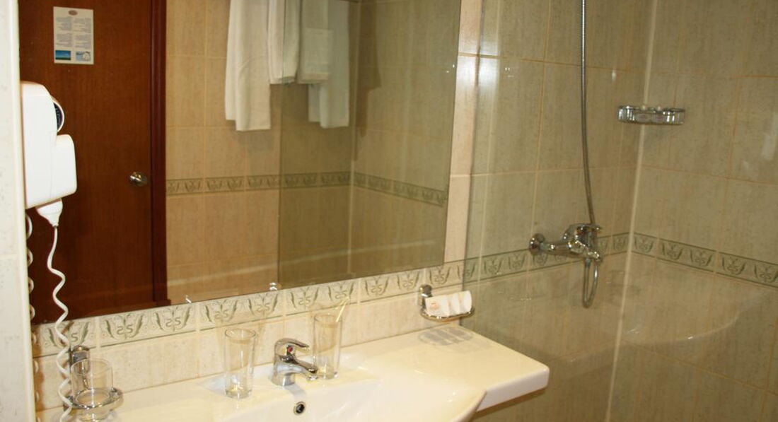 Номер у нас был с видом на бассейн -это в сторону моря и соответственно первых двух линий отелей, потому спать приходилось с закрытой балконной дверью (хорошо слышны все дискотеки Золотых Песков). В остальном обычный номер со стандартным набором мебели. В ванной комнате действительно удивила стеклянная перегородка для душа, выполненная на две трети проема. При неаккуратном движении душа вода оказывается на полу, что довольно скользко.