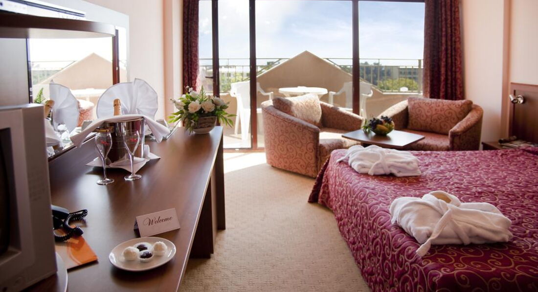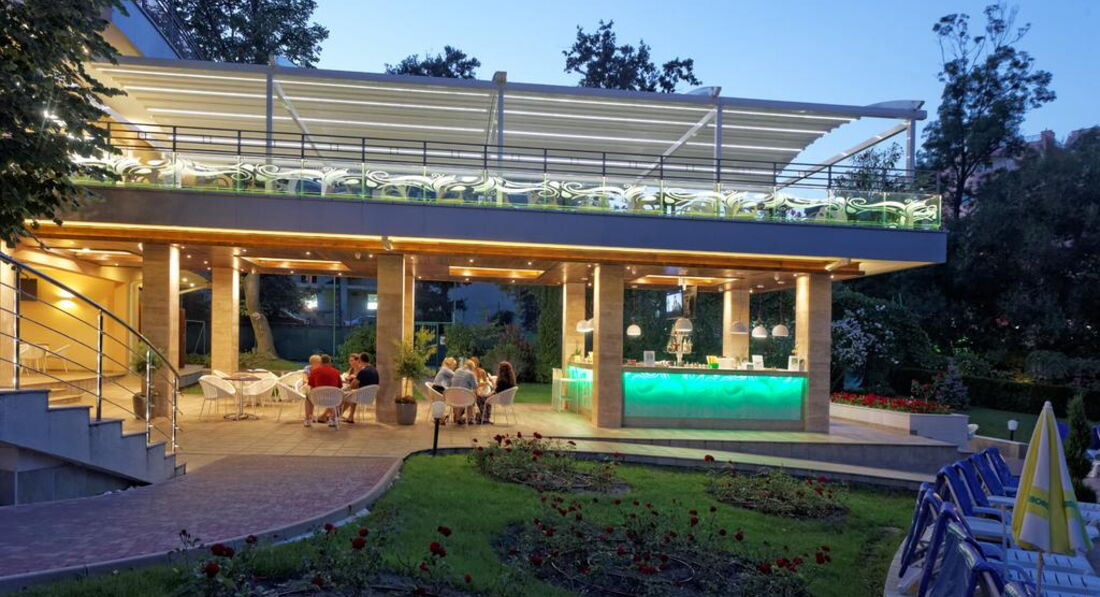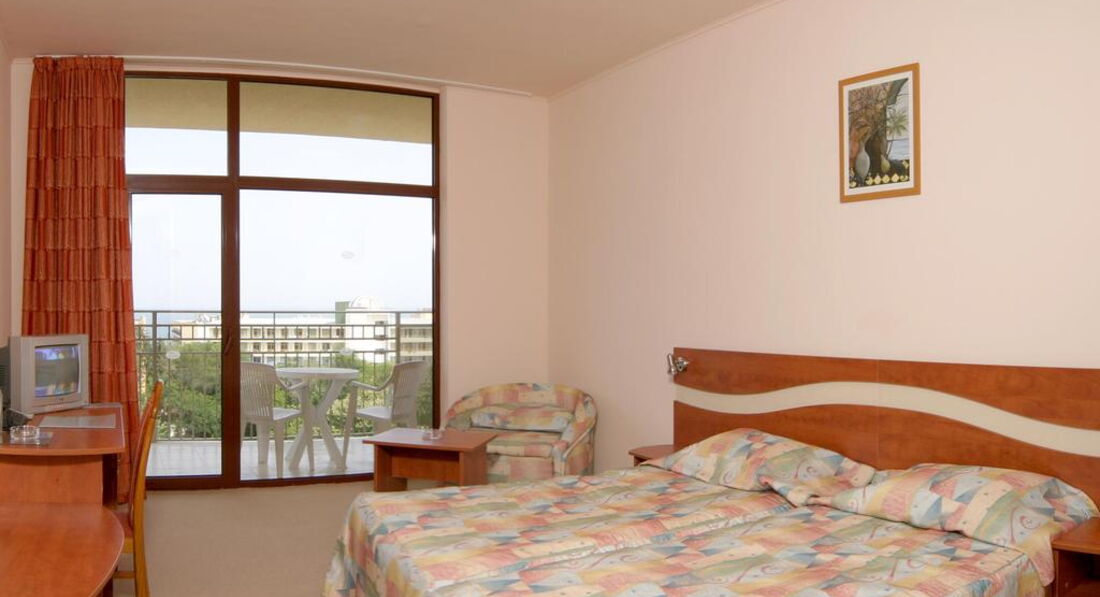 Отдыхали в июле 2007. Фотографии отеля нужно смотреть на его сайте, здесь - не он.Отель 4 звезды, новый, с современными прибамбасами в виде датчиков движения в коридоре и прикольного электронного ключа от номера, номер очень большой и красивый (правда, нам на двоих дали семейный, на 4 человек, в стандартном дабле балкон был втрое меньше, а на нашем можно было гулять). Виды из отеля все отличные, вокруг деревья, бассейы,отели, есть дорога для подъезда к отелю, по которой днем ездит иногда паровозик, ночью - полная тишина. За пользование мини-баром как холодильником надо платить 20 лев в неделю. Кондиционер работает хорошо. Около бассейна лежаки и зонты бесплатно, мест хватает, вокруг деревья, мило. До моря идти минут 10. Анимации в отеле никакой, но расположен очень близко к Party-street, на которой постоянно девушки зазывают на дискотеки (замучили!).