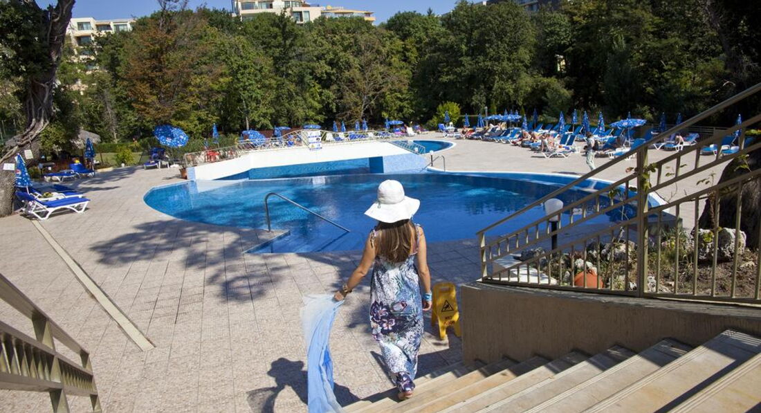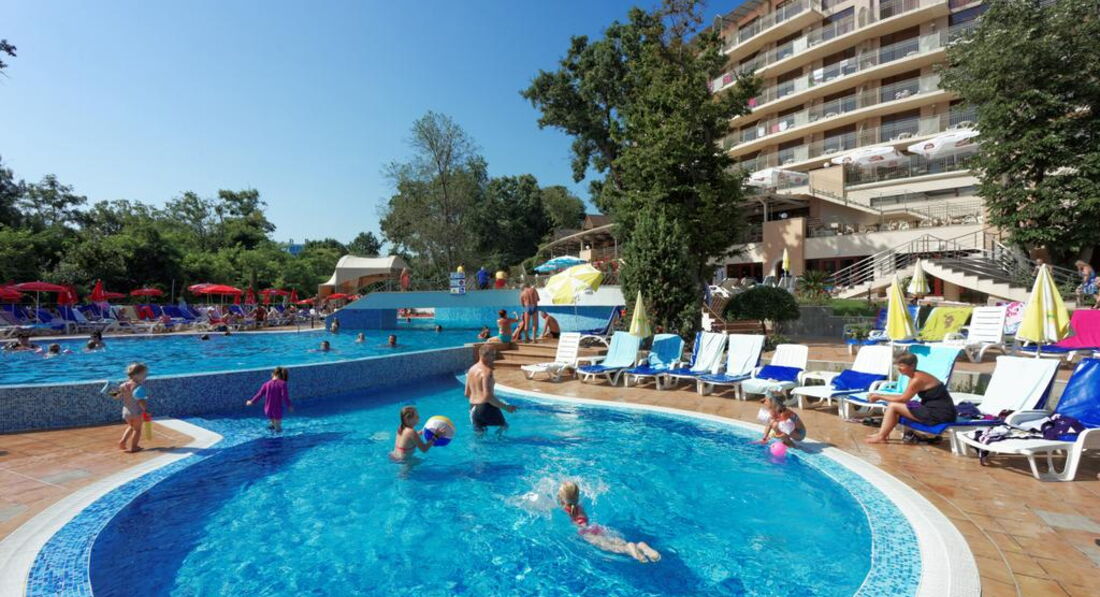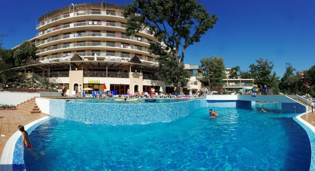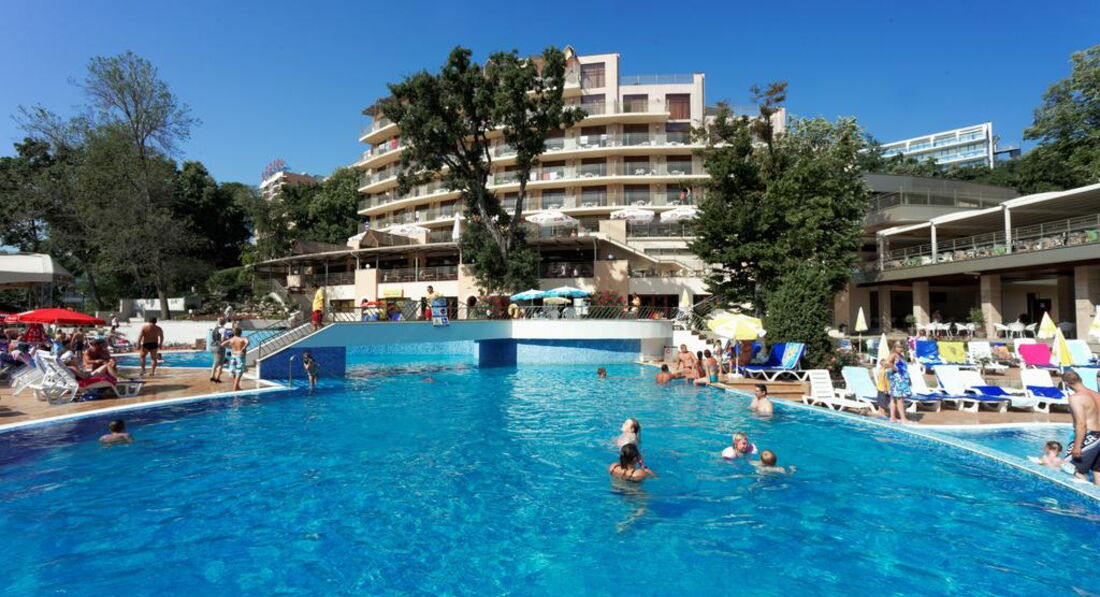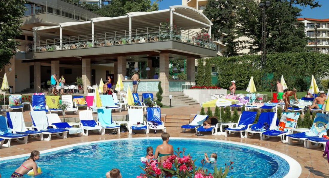 День Добрый! Отдыхала в этом отеле 5 дней в июне. Фото на сайте не соответствуют действительности, скидываю реальные фотографии! Звёздность отеля действительна - 4*. Чистый, аккуратный бассейн! Территория у отеля не большая - это правда(в Болгарии нет отелей с большими территориями), но компактная и чистая, и до моря не 600 метров, а 250-300, идти минут 10-15 и не полнцепёку а меж деревьями, вся болгария это высоченные деревья! Питание отличное (2кг за 5 дней набрала), вино у них вкусное, а то что бары до 23 работали бесплатно, нас не напрягало, так как мы с барменами сдружились и пили бесплатно до 3-х ночи!!! Надо просто везде оставаться людьми! За 2 лева через день оставленных на тумбочке, нам так номер вылизывали, что дома так бы не убрала!!! Очень нравилось сидеть с кофе на терассе на плетёных стульчиках, вид был хороший на парк (из-за высоких деревьев не видно было море)! Кофе, чай в апаратах на каждом углу, какой хочешь такой и берёшь!!! Соки пила только яблочнй и вишнёвый, апельсиновый реально был похож на юпи!!!Персонал ненавязыивый, люблю когда меня не напрягают и не навязываются! Внутренний бассейн есть, но я в нём не купалась! МОРЕ РЯДОМ!!! Всё что на пляже платно, но я взяла с собой с дому полотенце и зонтик, и не переломилась, но сэкономила 10 евро в день тем, что ставила свой маленький зонтик и лежала на своём полотенце!!! В общем отель хороший, чистый, уютный! Кому интересно, спрашиваю, всем отвечу!!!