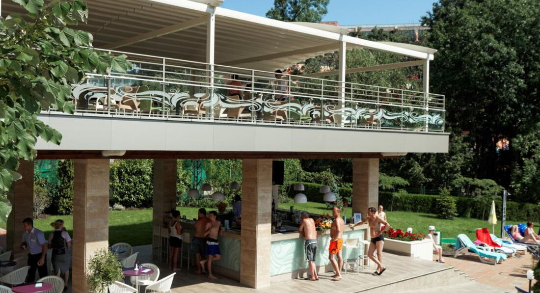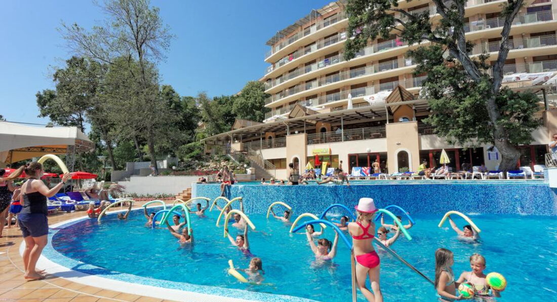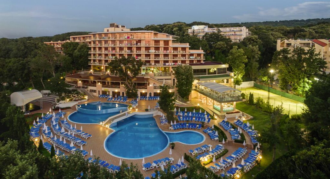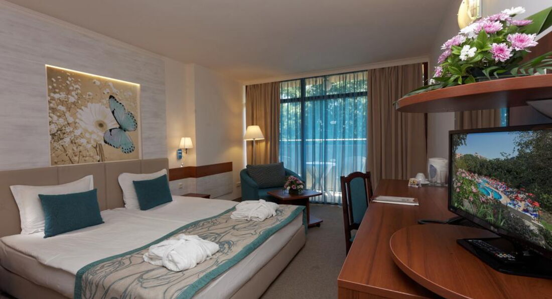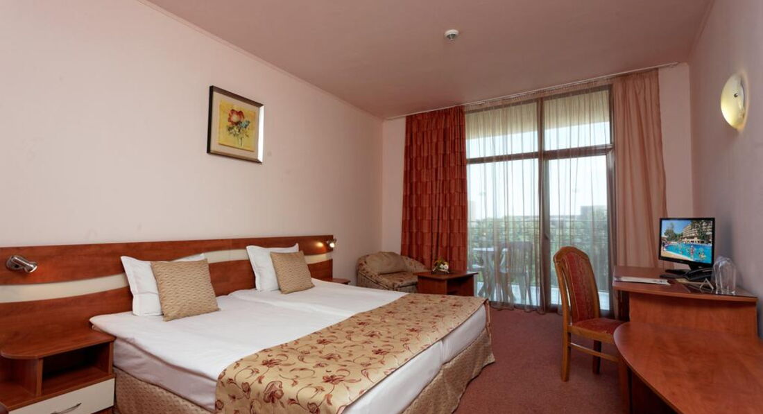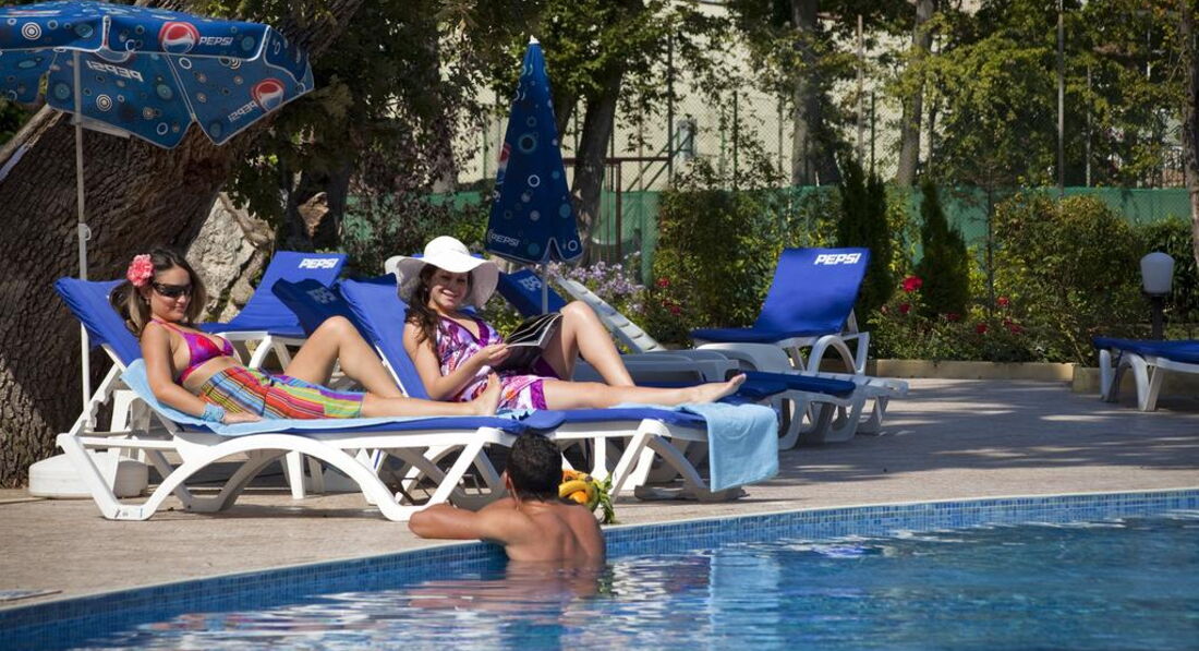 День Добрый! Отдыхала в этом отеле 5 дней в июне. Фото на сайте не соответствуют действительности, скидываю реальные фотографии! Звёздность отеля действительна - 4*. Чистый, аккуратный бассейн! Территория у отеля не большая - это правда(в Болгарии нет отелей с большими территориями), но компактная и чистая, и до моря не 600 метров, а 250-300, идти минут 10-15 и не полнцепёку а меж деревьями, вся болгария это высоченные деревья! Питание отличное (2кг за 5 дней набрала), вино у них вкусное, а то что бары до 23 работали бесплатно, нас не напрягало, так как мы с барменами сдружились и пили бесплатно до 3-х ночи!!! Надо просто везде оставаться людьми! За 2 лева через день оставленных на тумбочке, нам так номер вылизывали, что дома так бы не убрала!!! Очень нравилось сидеть с кофе на терассе на плетёных стульчиках, вид был хороший на парк (из-за высоких деревьев не видно было море)! Кофе, чай в апаратах на каждом углу, какой хочешь такой и берёшь!!! Соки пила только яблочнй и вишнёвый, апельсиновый реально был похож на юпи!!!Персонал ненавязыивый, люблю когда меня не напрягают и не навязываются! Внутренний бассейн есть, но я в нём не купалась! МОРЕ РЯДОМ!!! Всё что на пляже платно, но я взяла с собой с дому полотенце и зонтик, и не переломилась, но сэкономила 10 евро в день тем, что ставила свой маленький зонтик и лежала на своём полотенце!!! В общем отель хороший, чистый, уютный! Кому интересно, спрашиваю, всем отвечу!!!