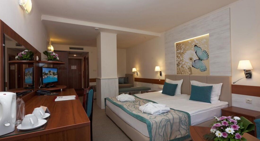 Отель внутри и снаружи нормальный,симпатичный. Номера все с балконами,где-то на полу плитка,где-то ковровое покрытие. Телевизор,холодильник есть,постель удобная. В отеле после 9 вечера бывает очень шумно- активная анимация на немецком и английском языке. После анимации никто не торопится расходится и гужбанят до середины ночи. Если номера будут ближе к рецепшену,( там рядом бар с бесплатными напитками и сама анимация), то выспаться не особо получится.