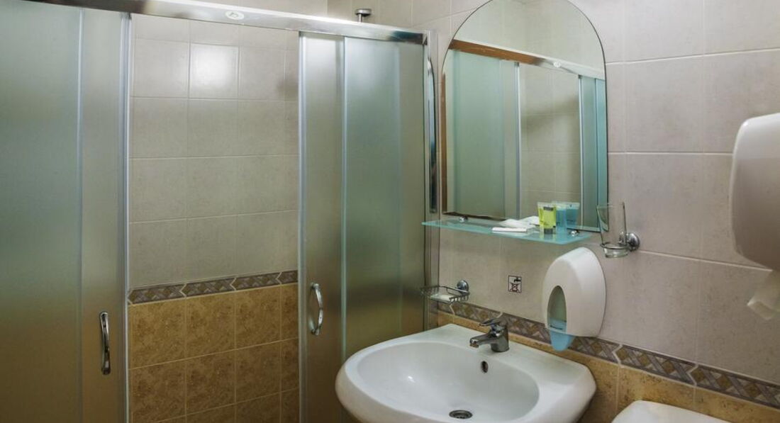 Теперь о номере: нам дали номер на 3-этаже с видом на стоянку и какие-то строения. Честно сказать, тут ни с одной стороны не будет хорошего вида из окна. Номер небольшой, комната метров 15-16. На стенах старенькие обои, в каких-то местах отошедшие от стен. Наш номер периодически заливает (это мы выяснили во время дождя), поэтому видны разводы на стенах и потолке. Маленький телевизор с одним русскоязычным каналом. Есть холодильник. Кондер работал. Отдельного описания требует туалет и душ: все в налете и грибке, запах общественного туалета невыносимый, жаль, не передается через фото. Просила уборщицу залить унитаз какой-нибудь химией, видно, у нее просто нет подобных химикатов, которые смогли бы с этим бороться. К тому же запах идет через вентиляцию. Два плюса: стеклянная дверца, а не шторка и наличие горячей воды. Даже ночью воду сливать не надо, сразу горячая льется. Дверь в ванную безбожно скрипит, ночью туда зайти, чтобы не разбудить всех, невозможно. О, забыла сказать о слышимости: это что-то! Помните, как в 12 стульях, когда Бендер решил остановиться у знакомого студента в общежитии. Так вот, здесь тоже самое. Слышно каждое слово соседей с обеих сторон.