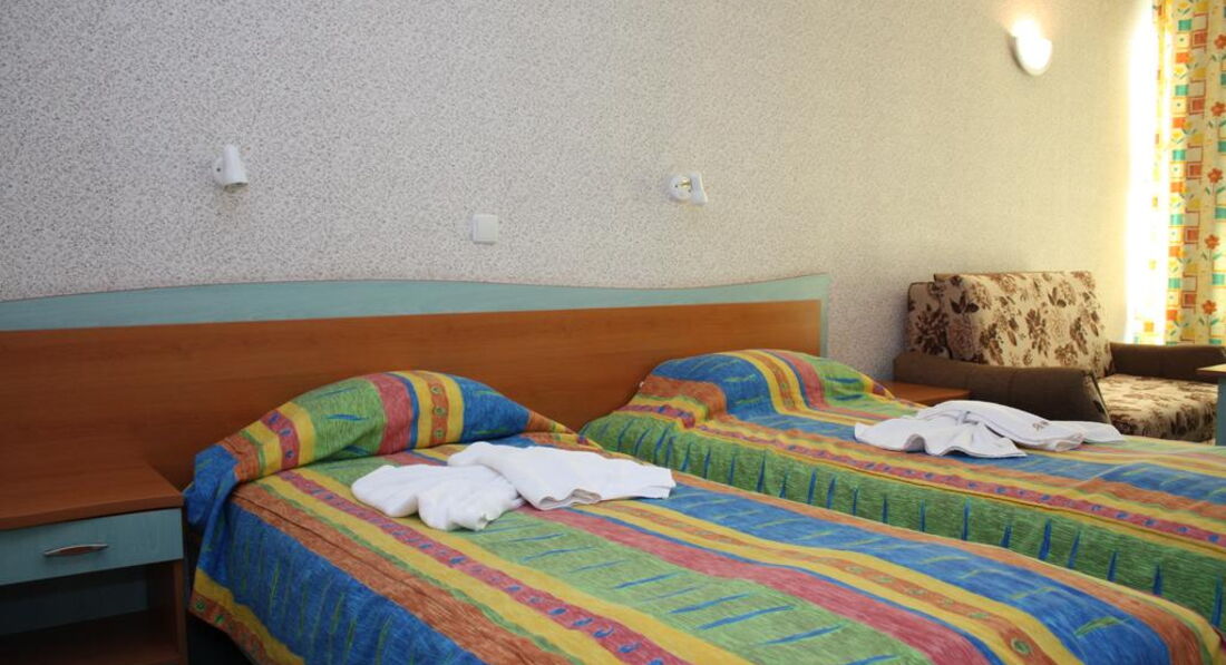 Отдыхали в августе 2012 года, с подружкой, ездили на 8 дней. Все очень понравилось. Не смотря на отзови которые читали раньше. Обслуживание хорошее, убирали каждый день, через день меняли полотенца. От моря идти, не спеша, ровно 9 минут. Хороший отель, чистый, кормят хорошо. Шведские столы, есть с чего выбрать. Расположен на центральной улице, близко с магазинами, кафе, дискотеками. Наши окна выходили как раз на центральную улицу, шума не было слышно. У нас был номер стандарт, две кровати, 2 тумбочки, туалетный столик, столик с телевизором, кондиционер, два больших зеркала, шкаф, вешалки. Душевая комната очень аккуратная, чистая. В Кранево всего три дискотеки, но нам это не испортило настроение, мы были на дискотеках и в Албене (по пляжу 30 минут), и на Золотых песках. В Кранево очень много лагерей, поэтому очень много детей и на дискотеках в том числе. Мы остались очень довольны, все понравилось. Хотя наверное Кранево все таки семейный курорт. Но кто хочет хорошо провести время найдет как это сделать, ведь по близости есть и Албена и Золотые Пески.....