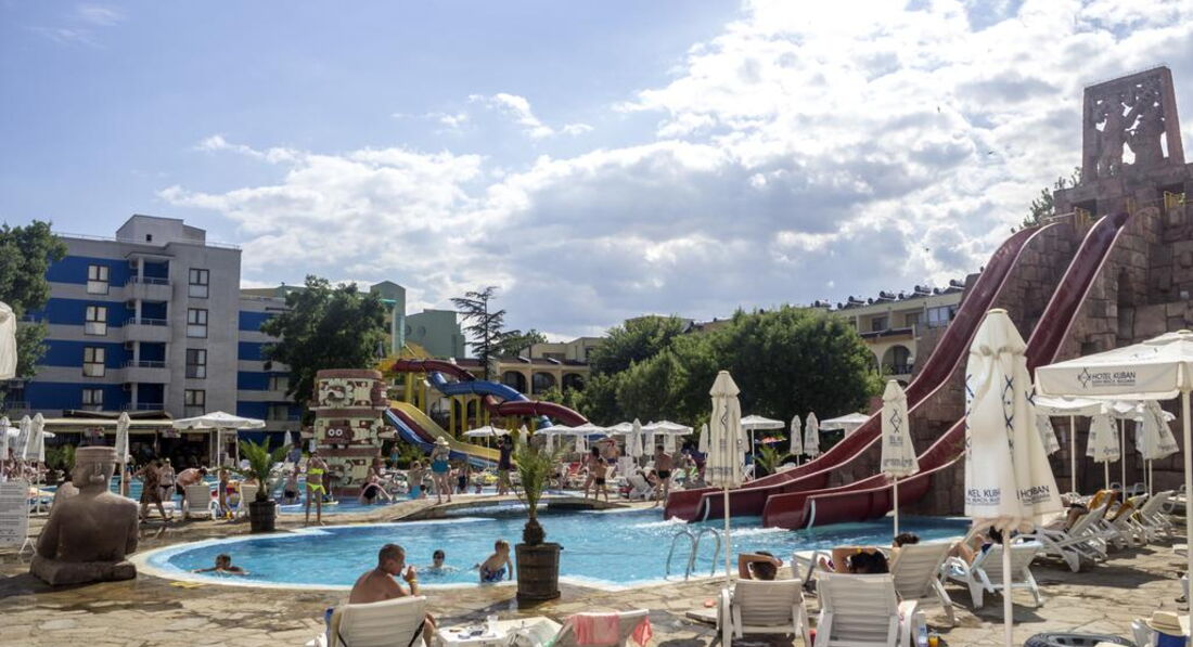 Отдыхали 17 июня по 28, от аэропорта 30 минут, приехали в 2200 заселили, ужин до 21.00,но день считается. Значит день пропал. Номер на 4:2комнаты,если не придираться --нормальные. Уборка каждый день, мыло, шампунь-нужно просить--не очень спешат ложить, но просишь-дают. Еда :я думаю каждыйдля себя найдет, но за блинчиками-очередь, за мороженым -очередь,тарелки,вилки,ложки--ждешь, еду не вынести-стоят возле дверей бдят, мы брали рюкзачок---выносили детям на вечер(ужин до 21.00),бар до 23.00 бесплатно, а дальше платно, много не выпьешь---нет еды, поэтому ходят трезвые, ну или напиться в ресторане до21.00.Мы покупали вечером кусочки пицы-2 лева(1 евро), в пекарне совсем рядышком.Рядом с отелем Магазин Младость--там цены обычные, в палатках и маленьких магазинчика цены в 2,а то и в3 раза дороже. Мы покупали желатинки,напитки,коктели--не поленитесь сходить в Сладость. Нашли рыночные черешня по2.20 лев(чуть больше 1евро).очень вкусная. В бассейне вода очень холодная, но дети плавали,я брала ради горок--но очень жалею, можно было сэкономить, горки не обязательно--тем более они не безопасны,шезлонге всегда заняты-надо вставать 6.00 -бежать занимать((это минус) .Если проспал завтрак можно покушать где бассейн -это плюс. Море--пляж песочек, море теплое, но было грязное. Мы не брали шезлонги8лев(4евро),лежали на покрывале--нам было норм. На улице шум, гам, музыка до5 утра балкон не откроешь.там ночная жизнь. В этот отель больше не поехала, тем более с детьми --мой совет не надо переплачивать за горки, и выбирать где потише. Мы гуляли был очень красивый отель Виктория, тишина., сам отель шикарный, рядом море(от Кубани5 минут). Если хочешь то 10-15минут и вы на шумной улице возле Кубани!