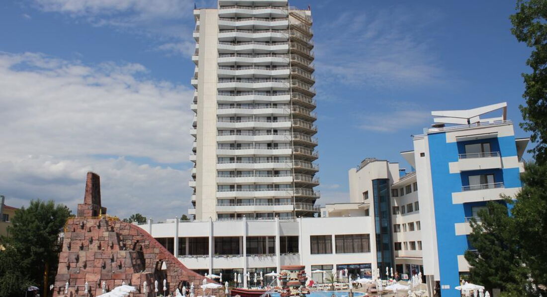 Недавно прилетела из Болгарии, осталась очень довольна! Сам отель находится в самом центре этого курорта, на его территории находиться аквапарк с 6 горками.На рецепшене говорят на русском. Я жила на 8 этаже и окна выходили на море - утром встаешь и в окно светит солнышко, поэтому спать долго не хочется. Еда в отеле- очень разнообразная.Допустим на завтрак всегда были: 3-4 вида салата + разнообразные сыры+ колбасы+ разные булочки+ чай, кофе, молоко, какао, гор.шоколад, вода, напитки+ Мюсли( разнообразные вроде как 6 видов) + блины + рзные сосиски + мясо в панировки + кеуриные крылышки + ну как обычно яйца+ бекон +всегда такой набор фруктов и на завтрак и на ужин ( яблоки, апельсины, грейпфрут, арбуз, дыня, виноград 2 вида, ПЕРСИКИ, Нектарины) и этот список фруктов был ВСЕГДА)))))А так же разные сладости. На ужин фрукты, супы(2 вида) салаты, горячее- кур.крылышки, рыба 2 вида,жаркое2 вида, и разнообразное мясо , ну и разный гарнир, на ужин из напитков можно было брать разный чай, а так же было мороженное каждый ужин. Так что еда- вкусная и не надоедала!