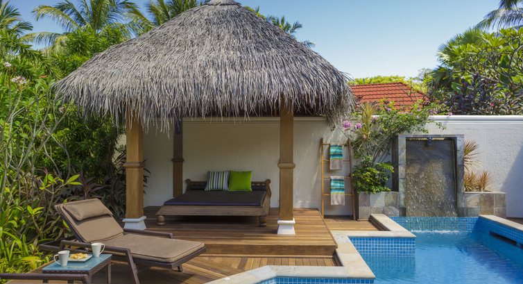 30 Beachfront Deluxe Bungalow (74 м2, макс. 3 або 2+2 чол.). Окремі одноповерхові бунгало з панорамним видом на океан, розташовані за кілька кроків від пляжу. Ліжко king-size, DVD-плеєр, кавоварка Nespresso. Ванна кімната з ванною і душем, душ просто неба в міні-садку.