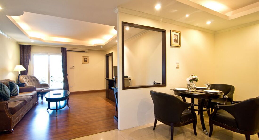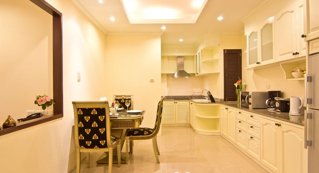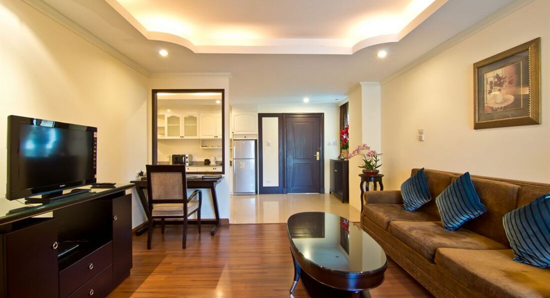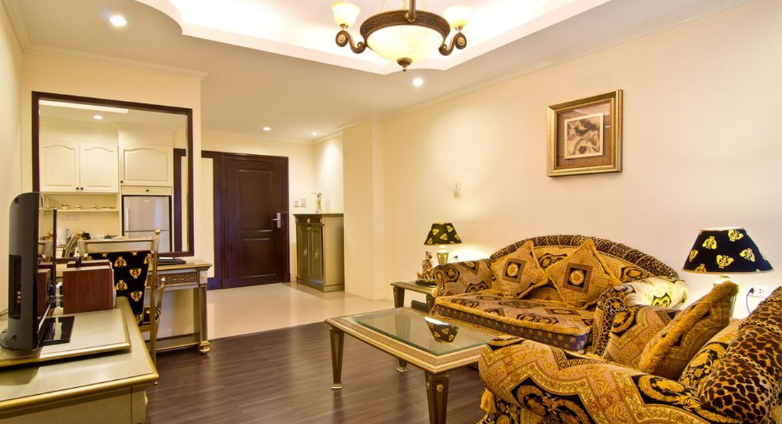 Мы проживали в номерах One bedroom suite?d номере присутствует всё что прописано на сайте отеля.Ванная комната укомплектована джакузи +душевая кабина,ежедневно пополняется шампунем,гелем д/душа,кремом д/тела,зубными щётками с пастой и бритвенным станком одноразовым,а так же шапочкой и ватными палочками.Есть в номере тапочки и халаты,достаточное кол-во полотенец в том числе и для бассейна.Плечиков достаточное колличество +сейф.Бельё меняют ежедневно.Кухня укомплектована полностью и посудой и микровеллой и чайником и большим холодильником.Ежедневно приносят чай,кофе,сахар и сухое молоко.Имеется в наличии зонтик на случай дождя.В холле,в любое время дня и ночи можно выпить горячего кофе или чая с вкусными песочными печеньками и посидеть у компьютера стоящих там же.Бассейн находится на втором этаже-он не очень большой,но с хорошей глубиной и отделением с джакузи.Имеются 3 сауны с сухим паром и хороший спортзал.Сам отель находится недалеко от Центр Фестиваля с одной стороны,в 12-15 мин. ходьбы от Тукома и в 14-17 мин. от магазина Биг Си Экстра. Расположение-удобное,тук-туки ездят в обе стороны,но в тоже время ночью можно спокойно спать.Рядом с отелем-3 обменных пункта,6-7 массажных салонов,а прямо напротив ресторана отеля-круглосуточный магазин.Вообщем все удовольствия за ваши деньги.От отеля до пляжа пешком-15 мин,на тук-туке в 3 раза быстрее.Своей территории отель не имеет,но это нас не смутило,хотя прошлые разы мы жили в отелях,где была своя и не маленькая территория.Вообщем смело могу рекомендовать туристам этот прекрасный ,очень уютный и вполне комфортный отель. Моя мамуля,которй 76 лет-в восторге осталась и от отеля и от Паттаии и от Бангкока и от самой страны и её доброжелательных и очень спокойных жителей дарящих нам бесконечно нежные улыбки.Побывав в этом раю однажды,нас всё время туда тянет.О экскурсиях писать не буду,о них много писали,пишут и будут писать,а вот о массажах немного напишу. В этот раз нам предложили посетить массажные салоны и салоны СПА под названием *НАРАЯ*.Мы делали 2 комплекса массажей и Спа процедур,5 и 7 дневные...остались от этих процедур в полном восторге,получается и прекрасно отдохнули,так ещё и здоровье поправили своё.На массажи нас привозили и отвозили после процедур назад в отель.Вообщем сервис-на подобающем уровне.От души желаю всем рассматривающим Тайланд ,как страну своего очередного отпуска,ехать туда с удовольствием-там ВЫ его получите в полном объёме и от отеля и от массажей и от шопинга...кому что интересно!!!Я прощаюсь с любимым Тайландом на этот год,НО надеюсь не раз ещё в него вернуться!!!Чего и всем ВАМ дорогие туристы от всей души ЖЕЛАЮ!!!